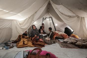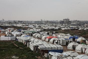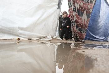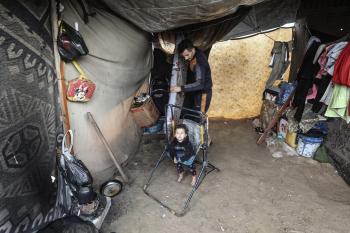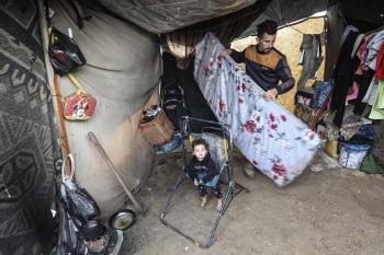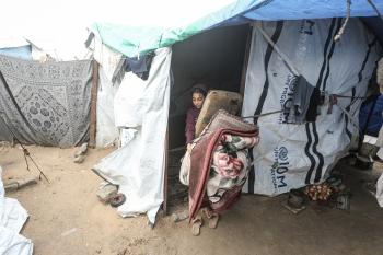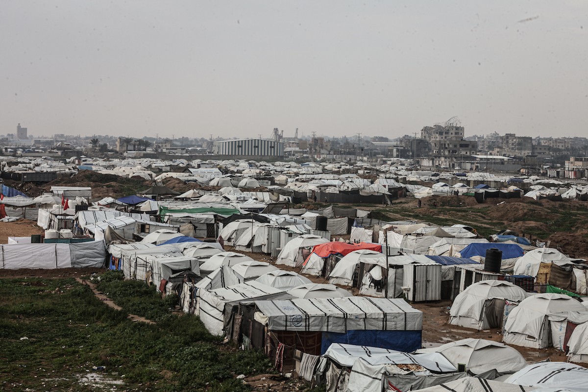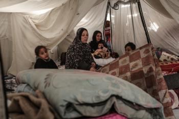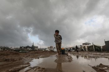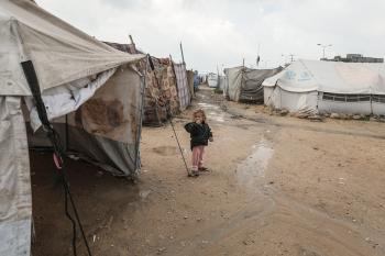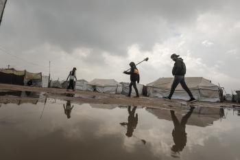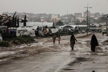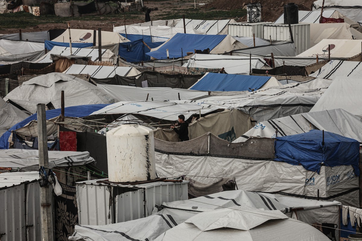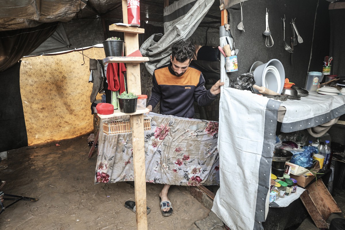 يواجه اللاجئون الفلسطينيون ظروفاً قاسية بعد أن غمرت الأمطار الغزيرة خيامهم في مخيم البريج بوسط قطاع غزة في 24 فبراير/شباط 2026. (صورة: معز صالحي)