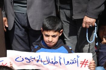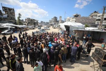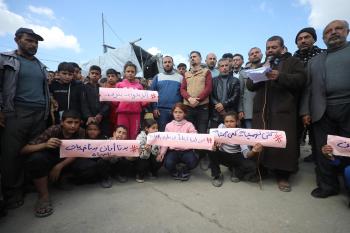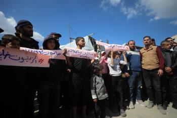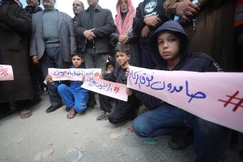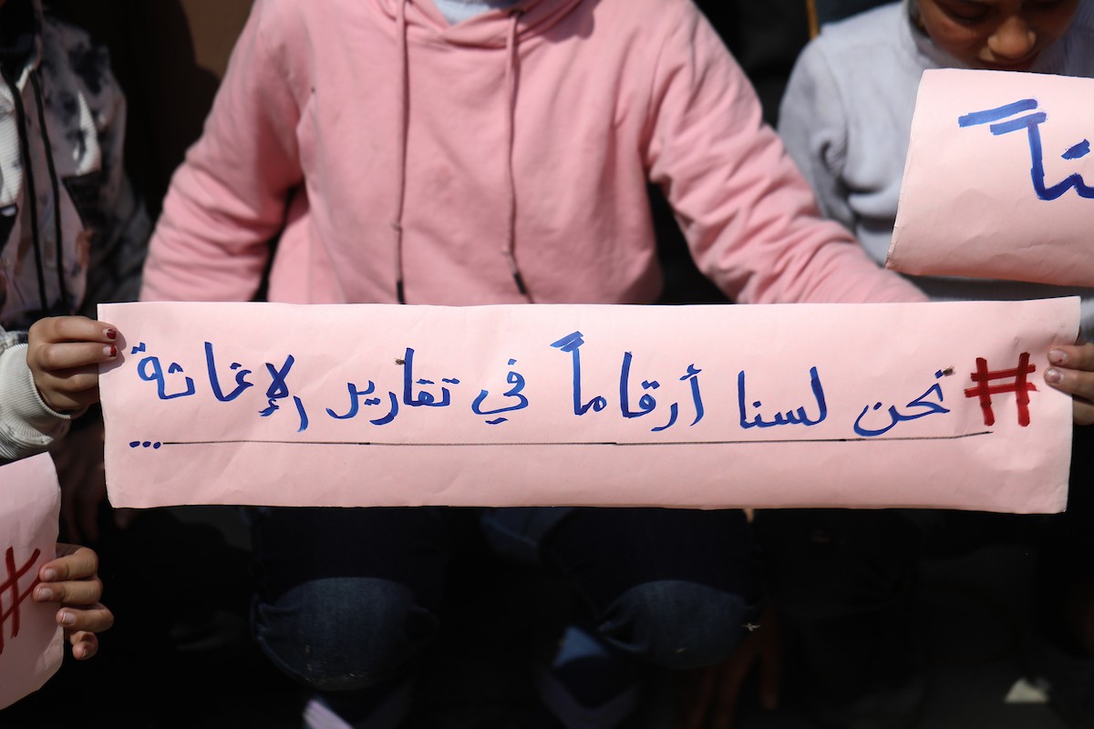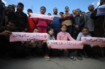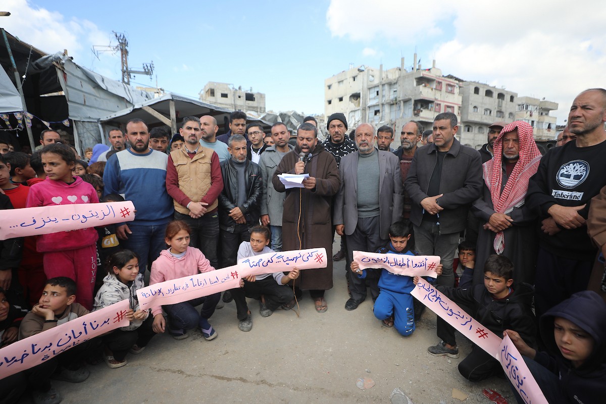 نظمت عائلات فلسطينية نازحة، تعيش وسط الأنقاض في حي الزيتون بمدينة غزة، احتجاجًا للمطالبة بتوفير المياه والغذاء والرعاية الصحية والتعليم للنازحين، ووقف الهجمات الإسرائيلية المستمرة ضدهم. مدينة غزة، 25 فبرايرشباط 2026. تصوير عمر أشتوي