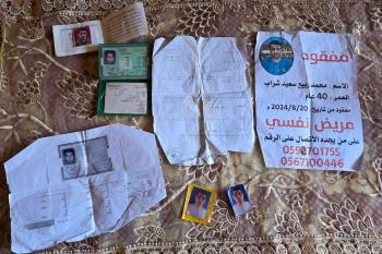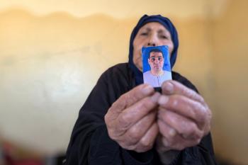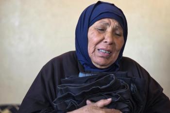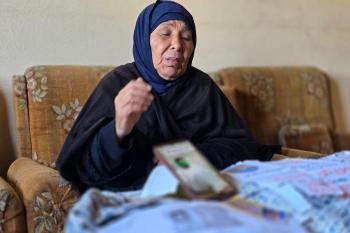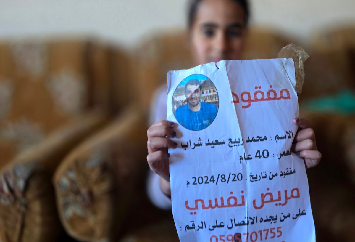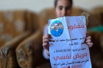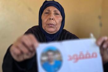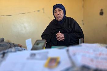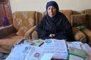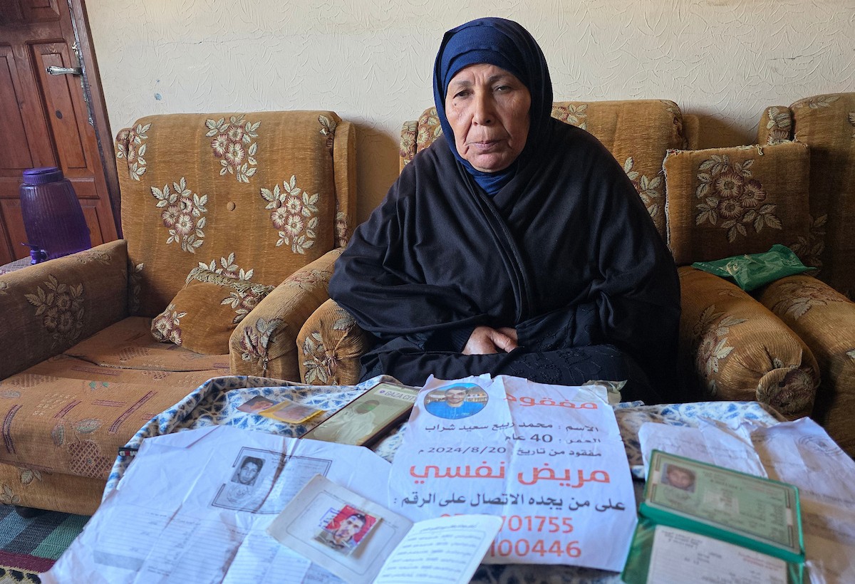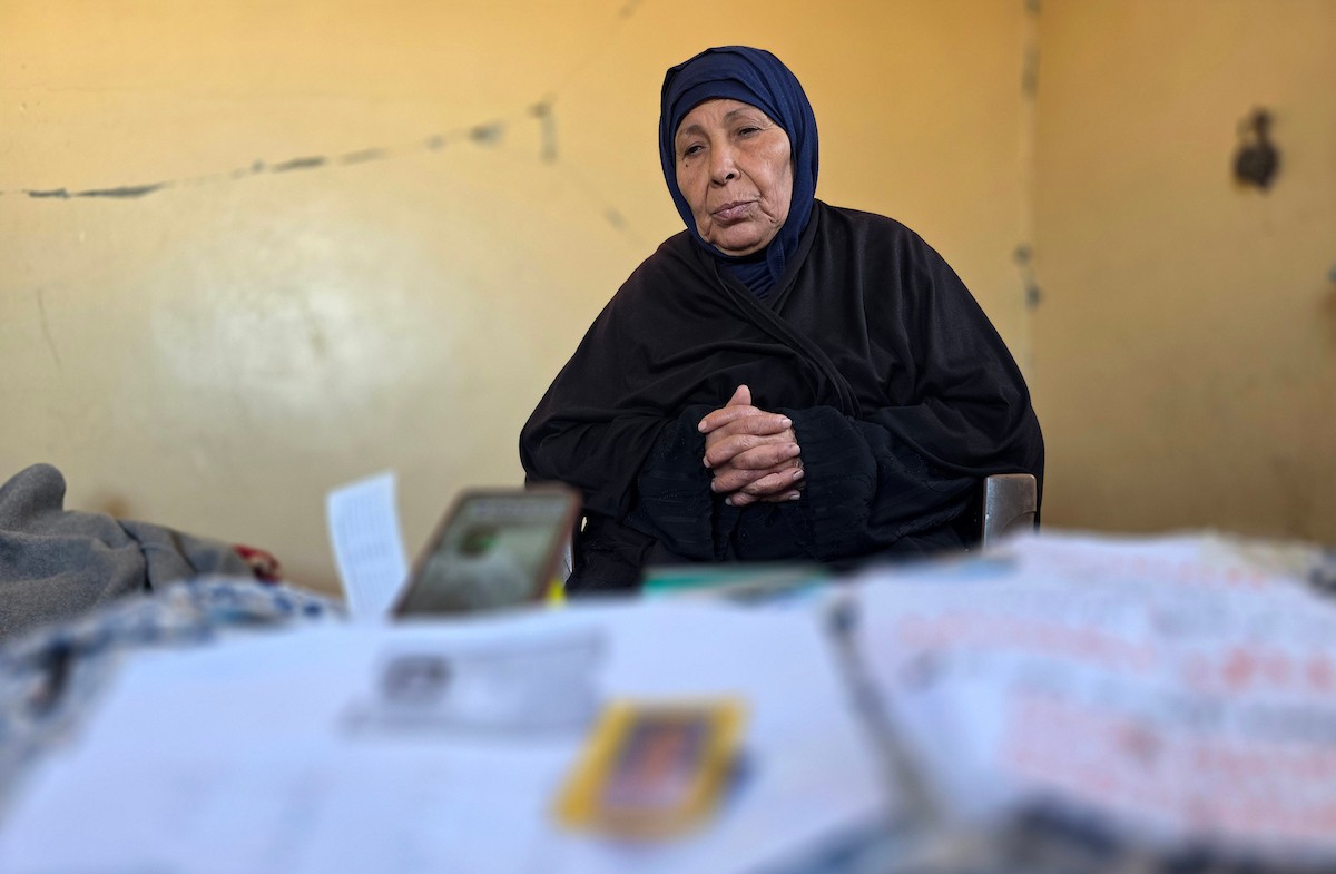 المسنة زهر شراب تنتظر معرفة مصير ابنها المفقود من ذوي الإعاقة الذهنية بعد تداول مستوطنين صورة له على مواقع التواصل مرفقة بتعليق عنصري، خان يونس، جنوب قطاع غزة، 26 فبراير/شباط 2026. تصوير: طارق محمد