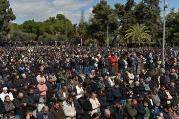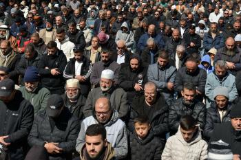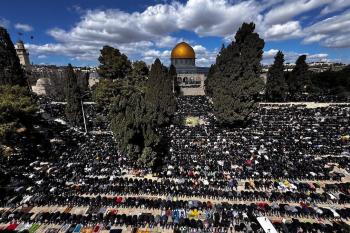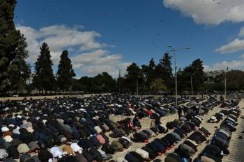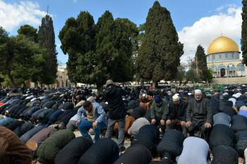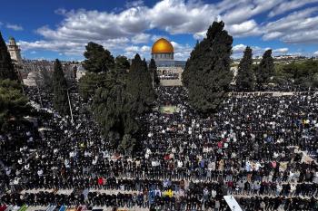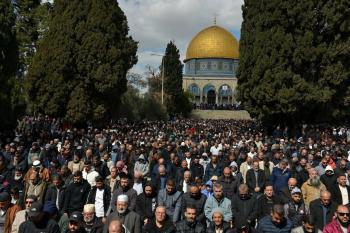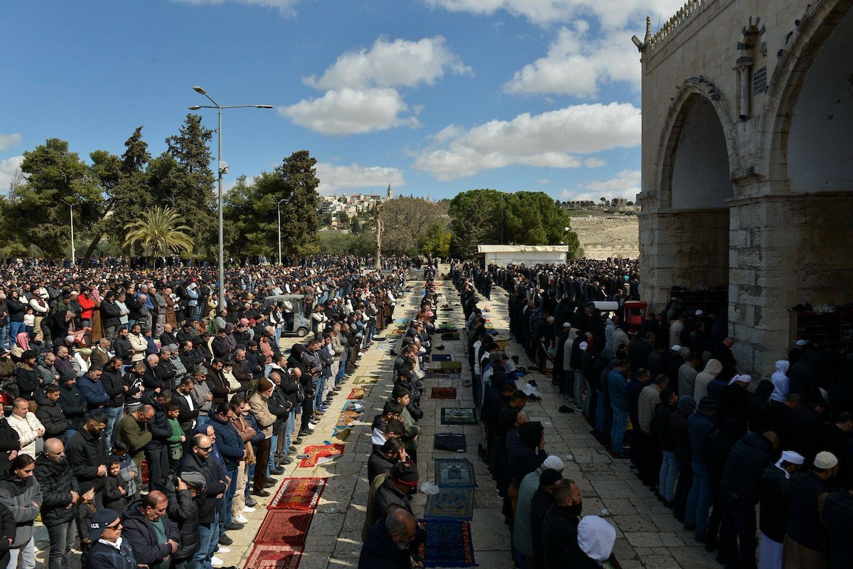 أدى الفلسطينيون صلاة الجمعة الثانية من شهر رمضان في المسجد الأقصى بالقدس. ووفقًا لدائرة الأوقاف الإسلامية، حضر الصلاة 100 ألف مصلٍّ رغم القيود الإسرائيلية المفروضة على الفلسطينيين. القدس، 27 فبراير/شباط 2026. صورة من دائرة الأوقاف الإسلامية بالقدس.