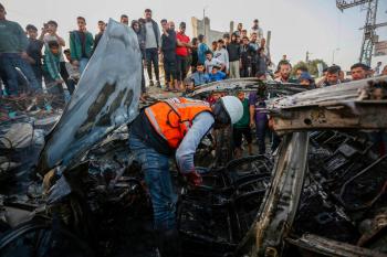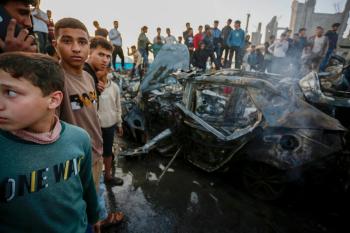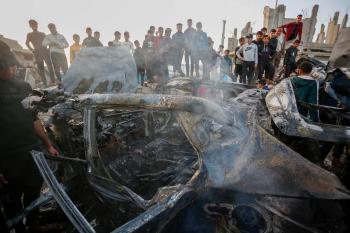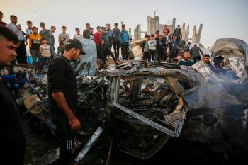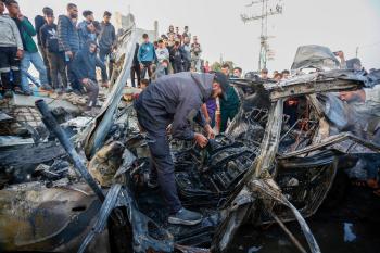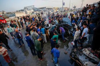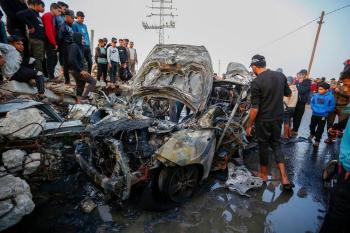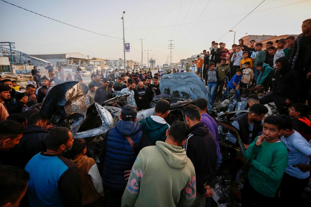 يتفقد فلسطينيون آثار غارة جوية إسرائيلية استهدفت مركبة في شارع صلاح الدين قرب مدخل مخيم المغازي للاجئين وسط قطاع غزة، في 4 أبريل/نيسان 2026 (صورة: أحمد إبراهيم)