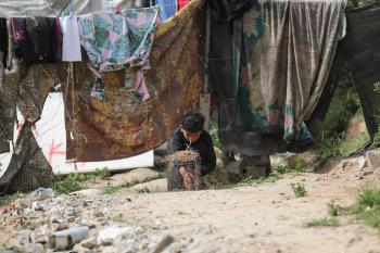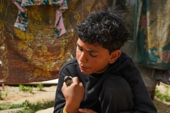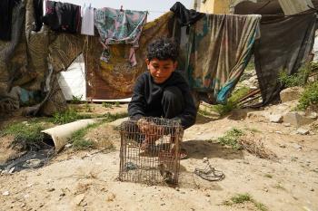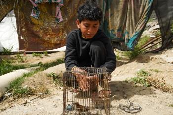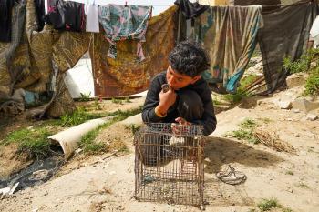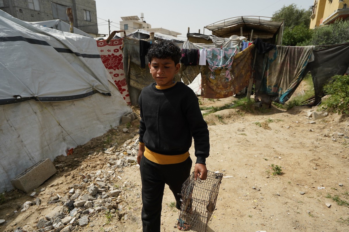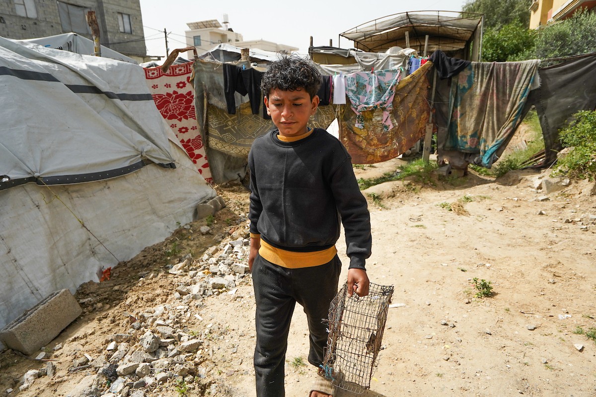 طفل فلسطيني يحمل قفصًا، محاولًا اصطياد الطيور لتربيتها لاحقًا كغذاء داخل خيمته، في مخيم البريج للاجئين وسط قطاع غزة، 4 أبريل/نيسان 2026، وسط نقص حاد في الغذاء وظروف إنسانية مزرية يواجهها السكان نتيجة الحرب. صورة: (رمزي أبو عامر)