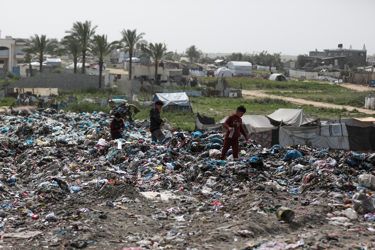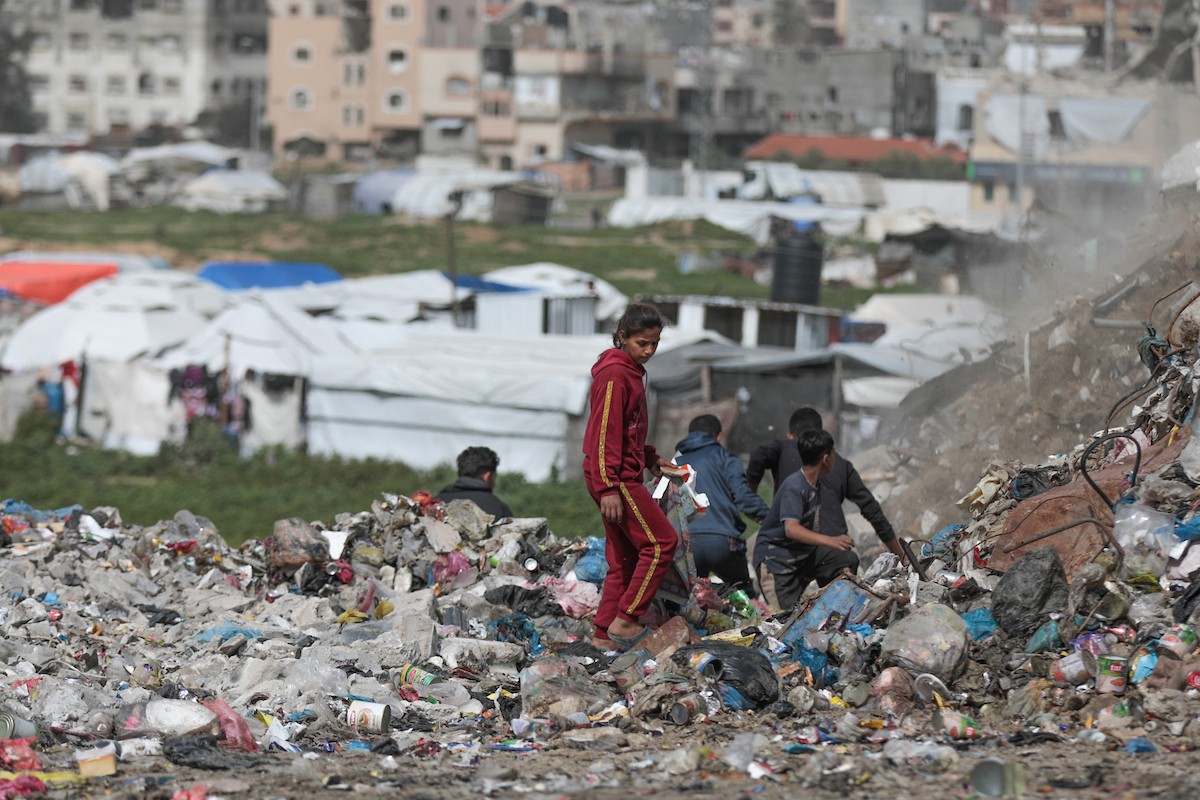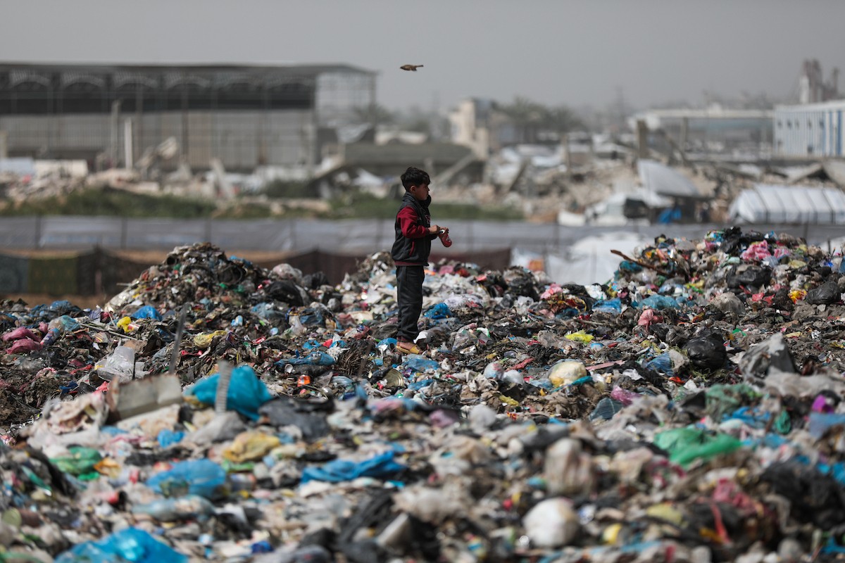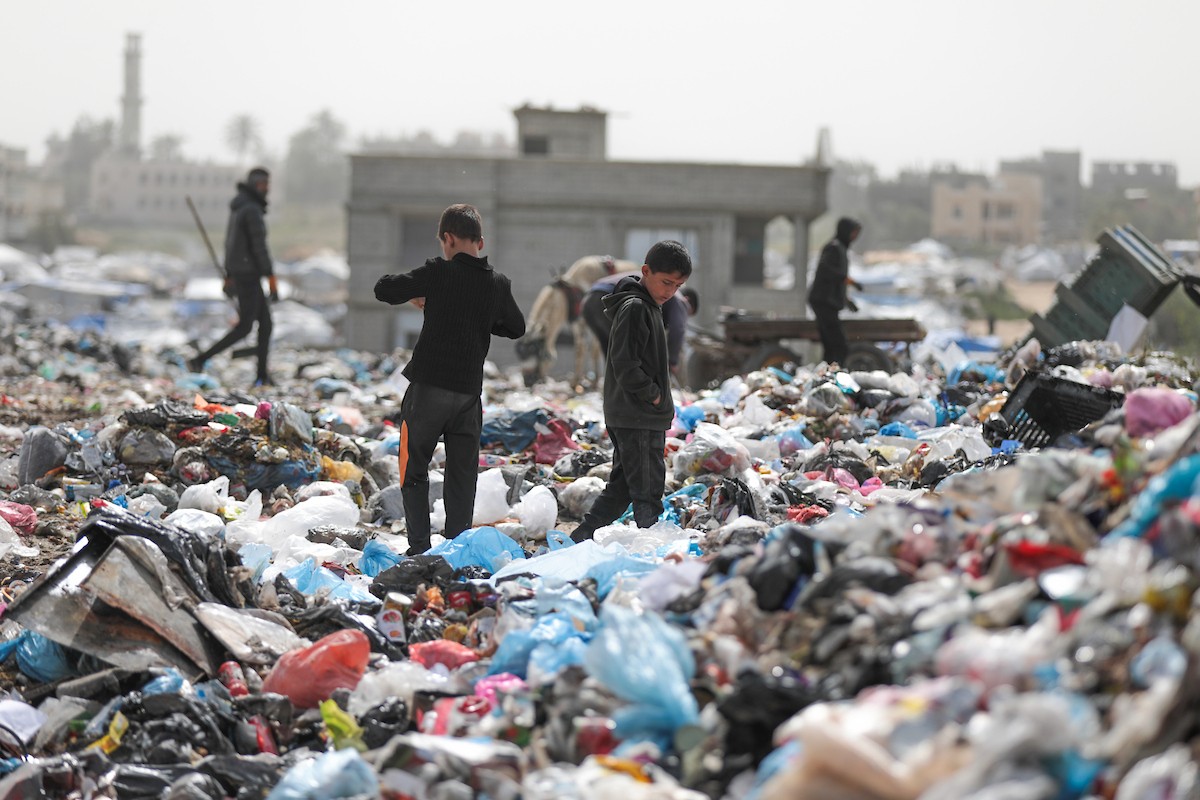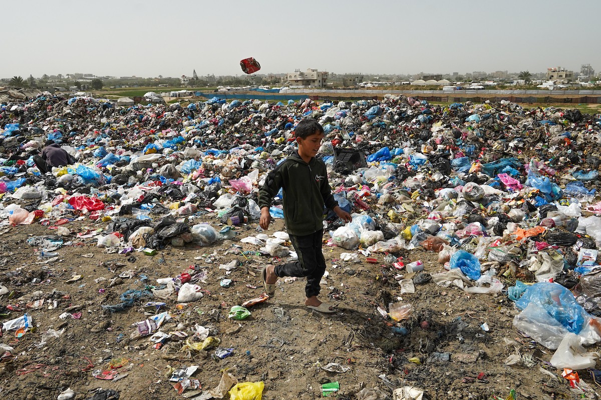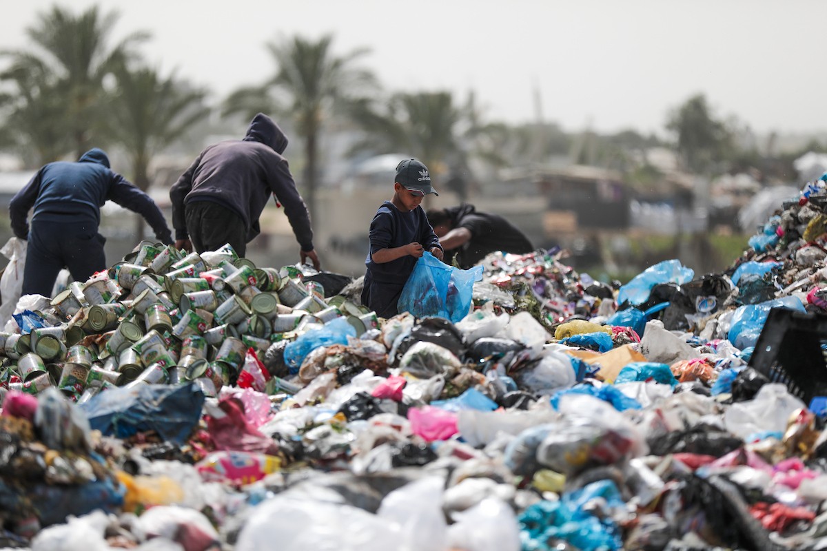 أطفال فلسطينيون يبحثون بين أكوام القمامة عن بقايا الطعام أو الألعاب في مكب نفايات بمخيم البريج للاجئين وسط قطاع غزة، في 4 أبريل/نيسان 2026، بالتزامن مع يوم الطفل الفلسطيني، صورة:( رمزي أبو عامر)