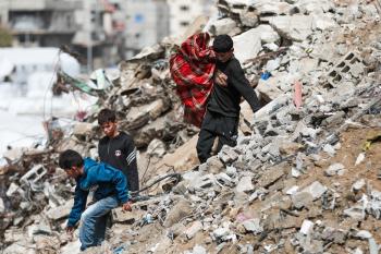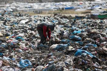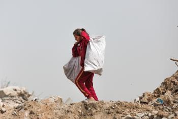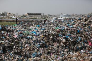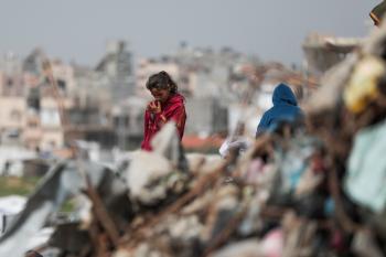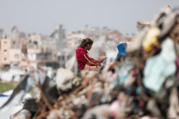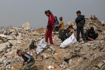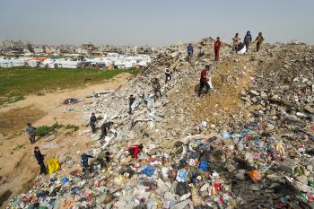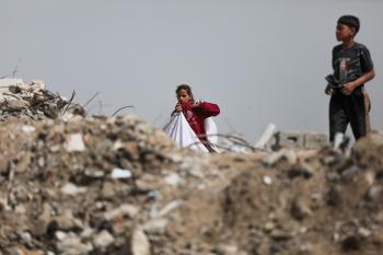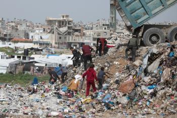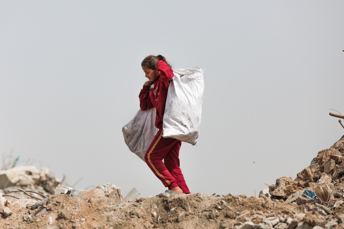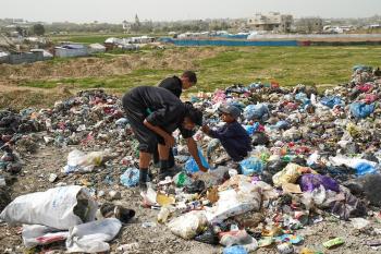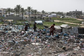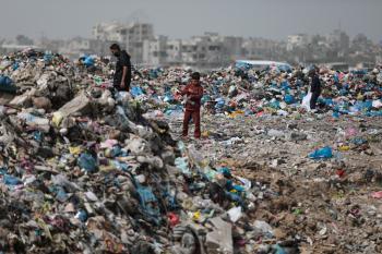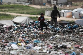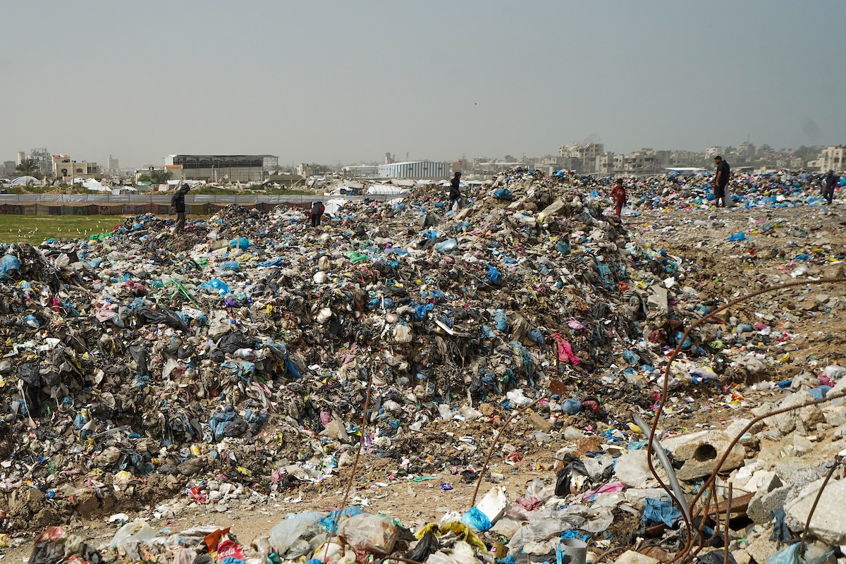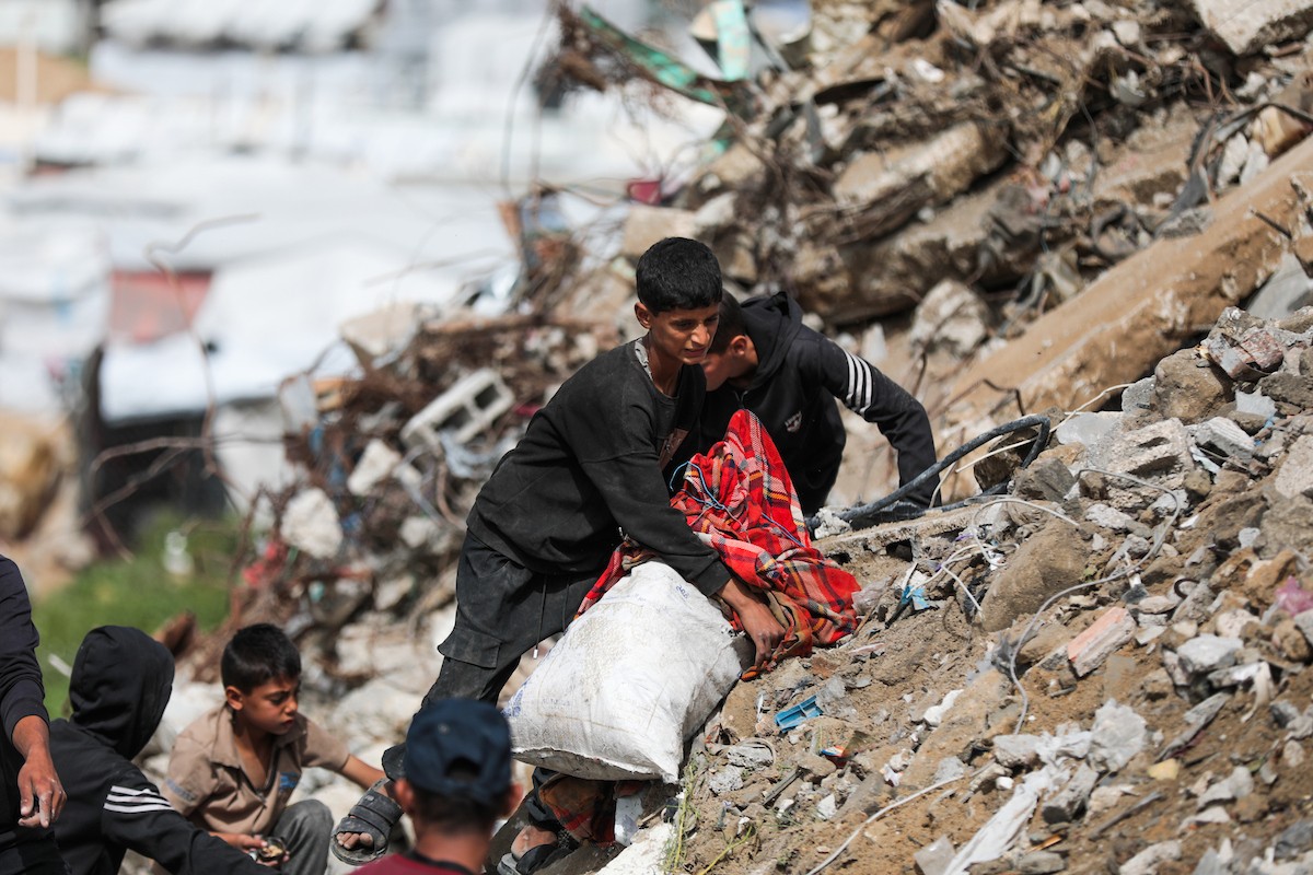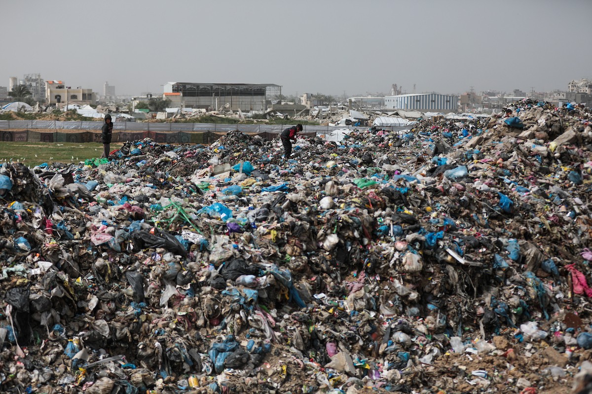 أطفال فلسطينيون يبحثون بين أكوام القمامة عن بقايا الطعام أو الألعاب في مكب نفايات بمخيم البريج للاجئين وسط قطاع غزة، في 4 أبريل/نيسان 2026، بالتزامن مع يوم الطفل الفلسطيني، صورة:( رمزي أبو عامر)