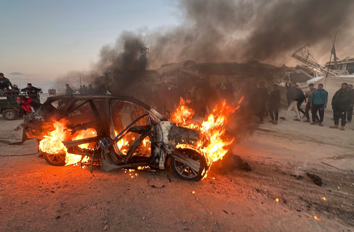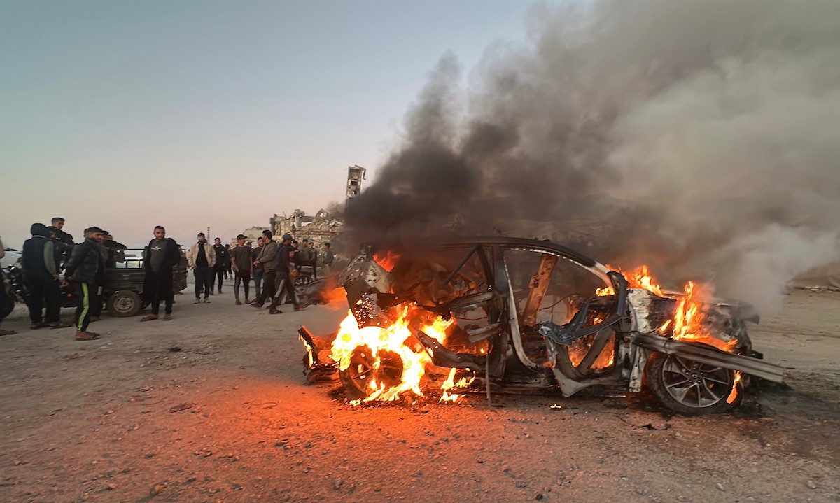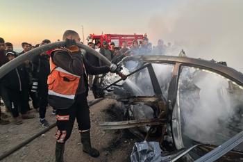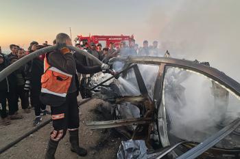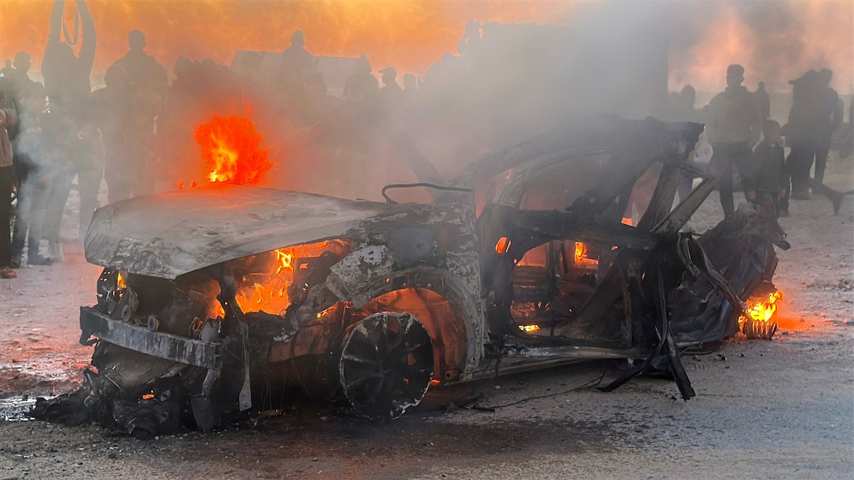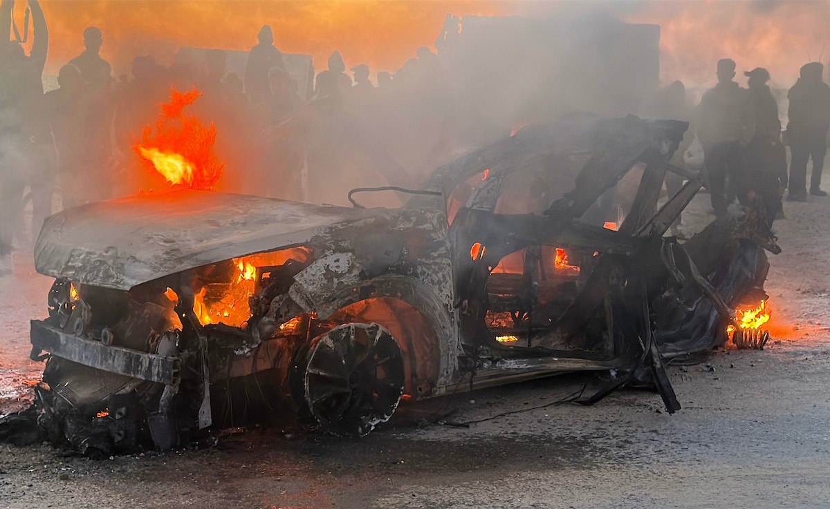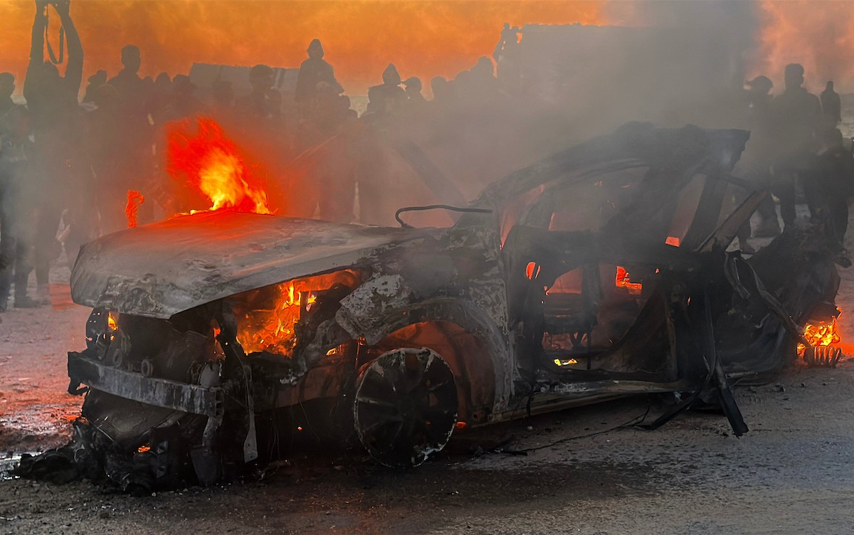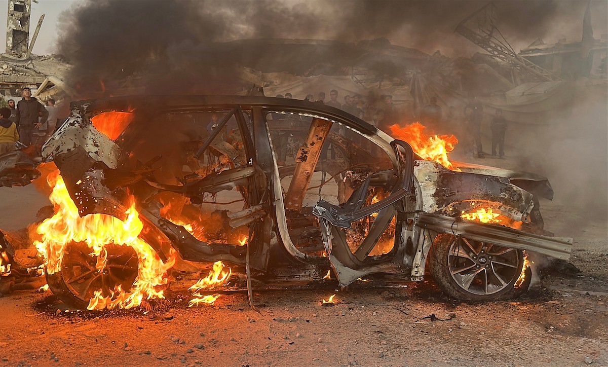 مركبة الزميل الصحفي الشهيد محمد وشاح التي دمرها صاروخ أطلقته طائرة مسيّرة إسرائيلية خلال عملية اغتيال مباشرة غرب مدينة غزة، 8 أبريل/نيسان 2026، (صورة: هادي داود )