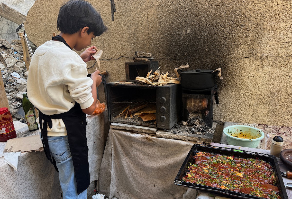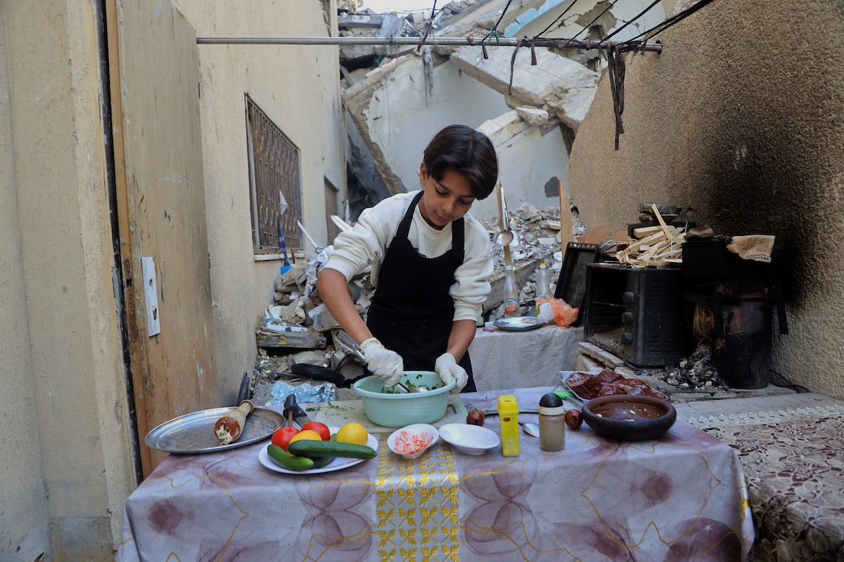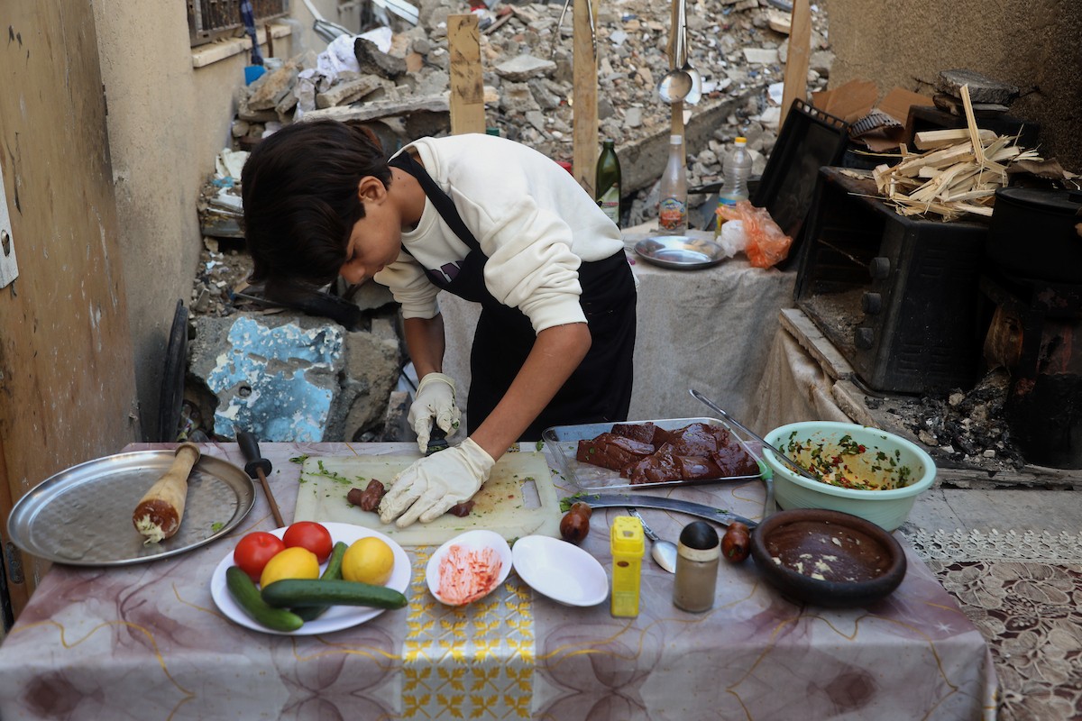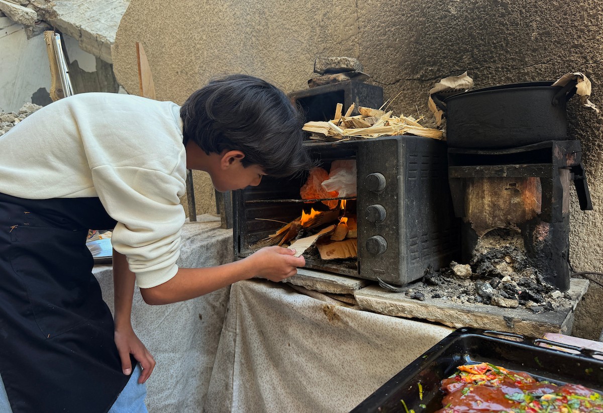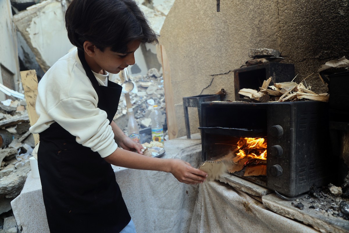 ياسر عياد، فتى فلسطيني (14عامًا) يمارس مهاراته في الطبخ على نار الحطب بجوار أنقاض منزل عائلته المدمر في مدينة غزة، 10أبريل/نيسان 2026. تصوير: محمد الأسود