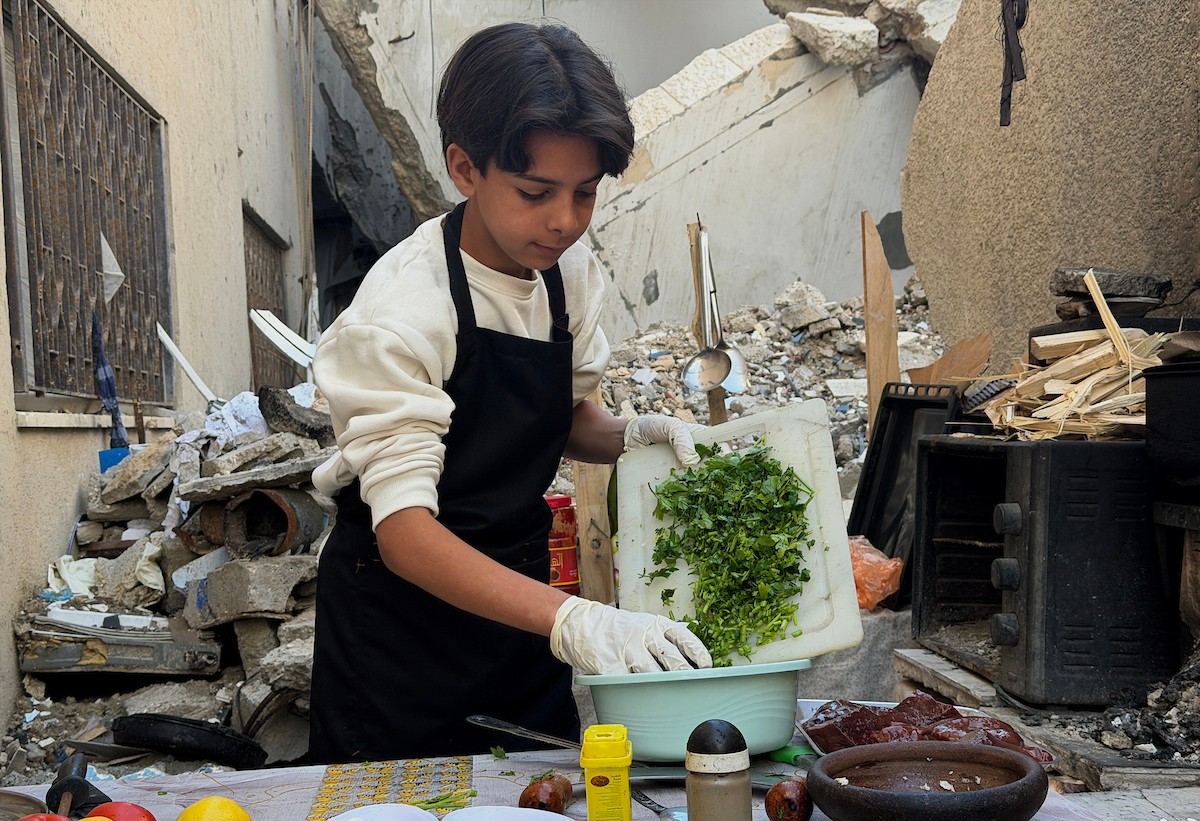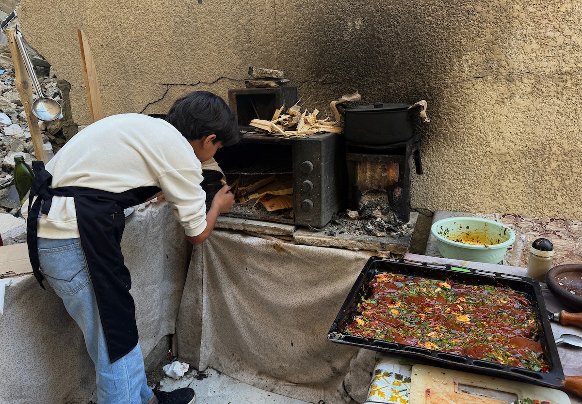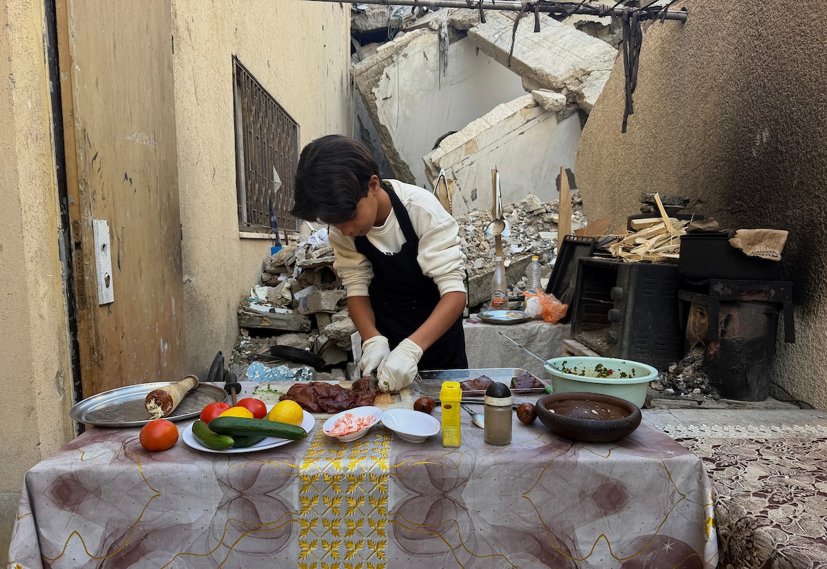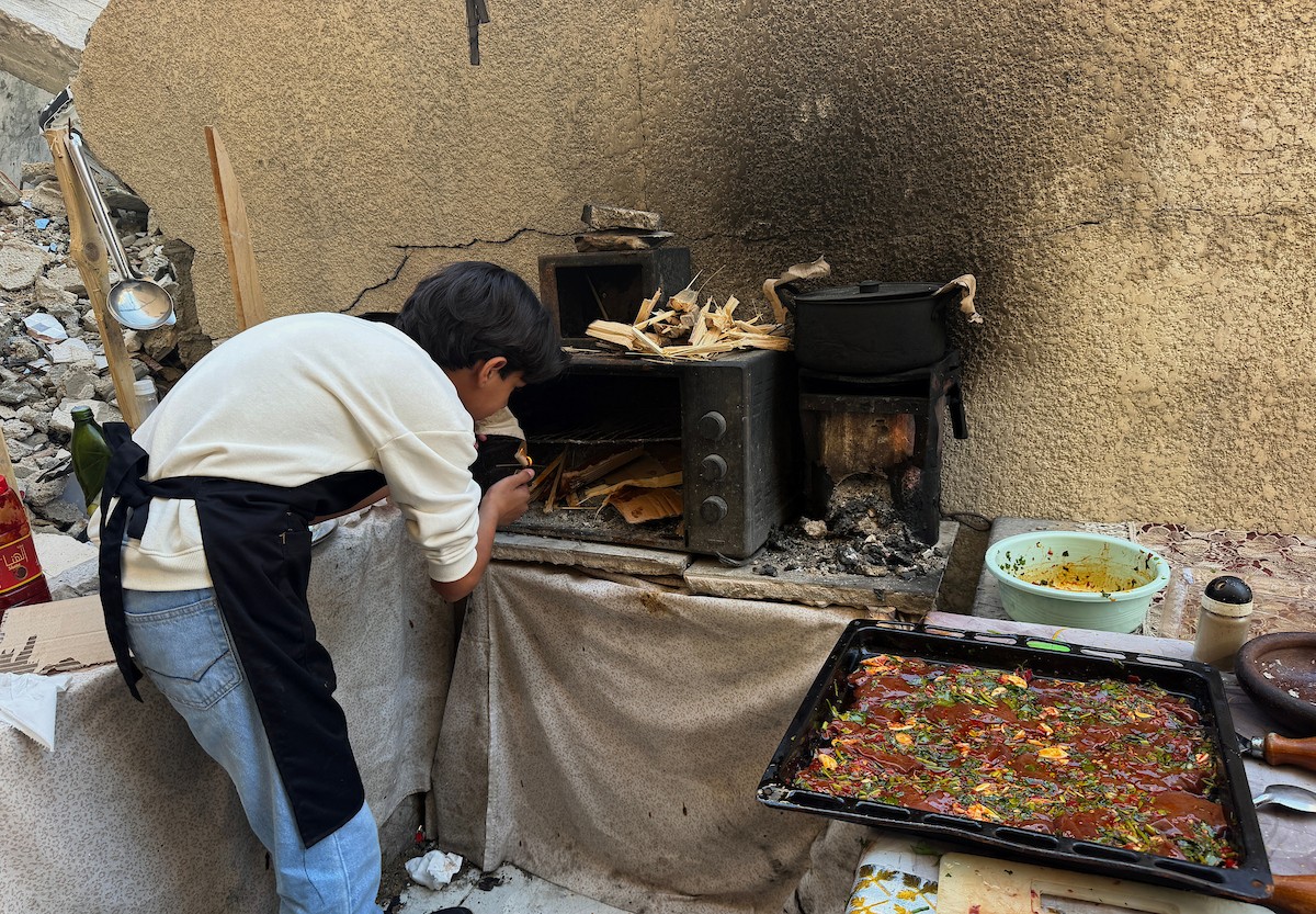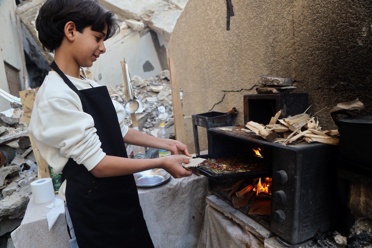 ياسر عياد، فتى فلسطيني (14عامًا) يمارس مهاراته في الطبخ على نار الحطب بجوار أنقاض منزل عائلته المدمر في مدينة غزة، 10أبريل/نيسان 2026. تصوير: محمد الأسود