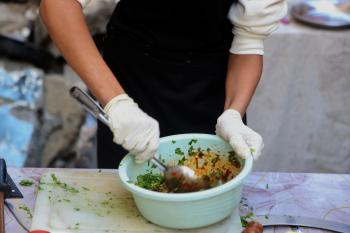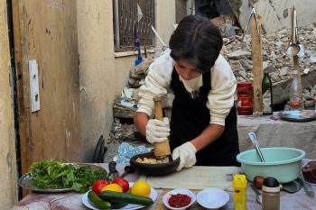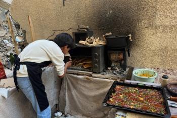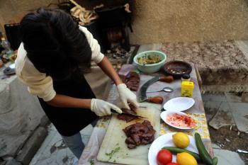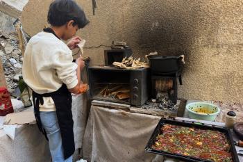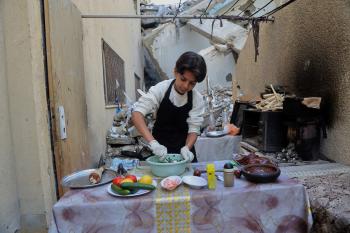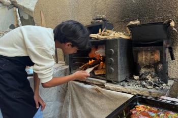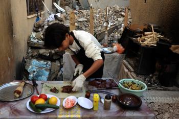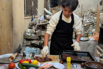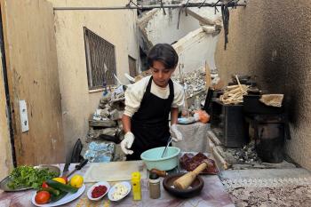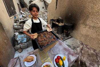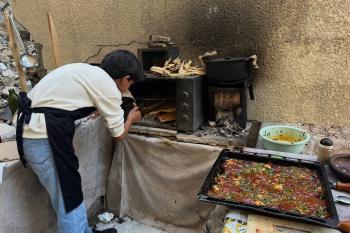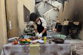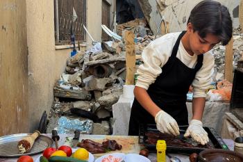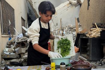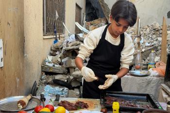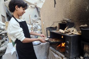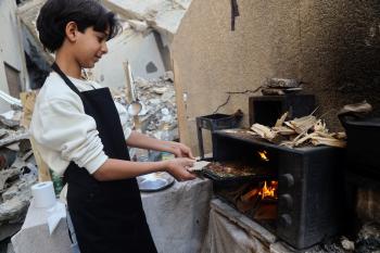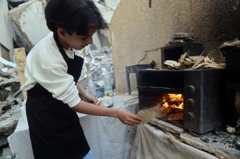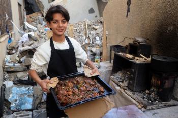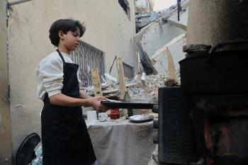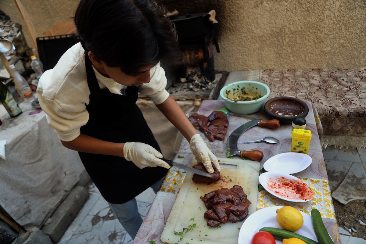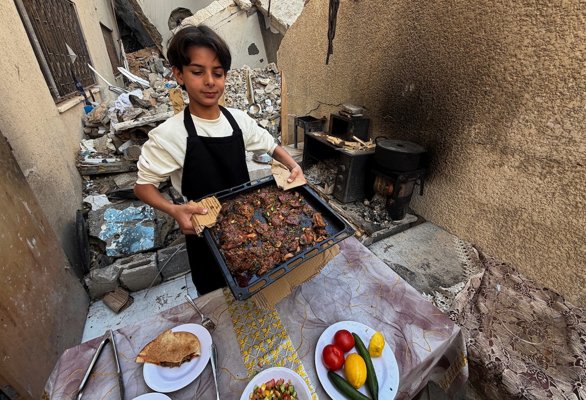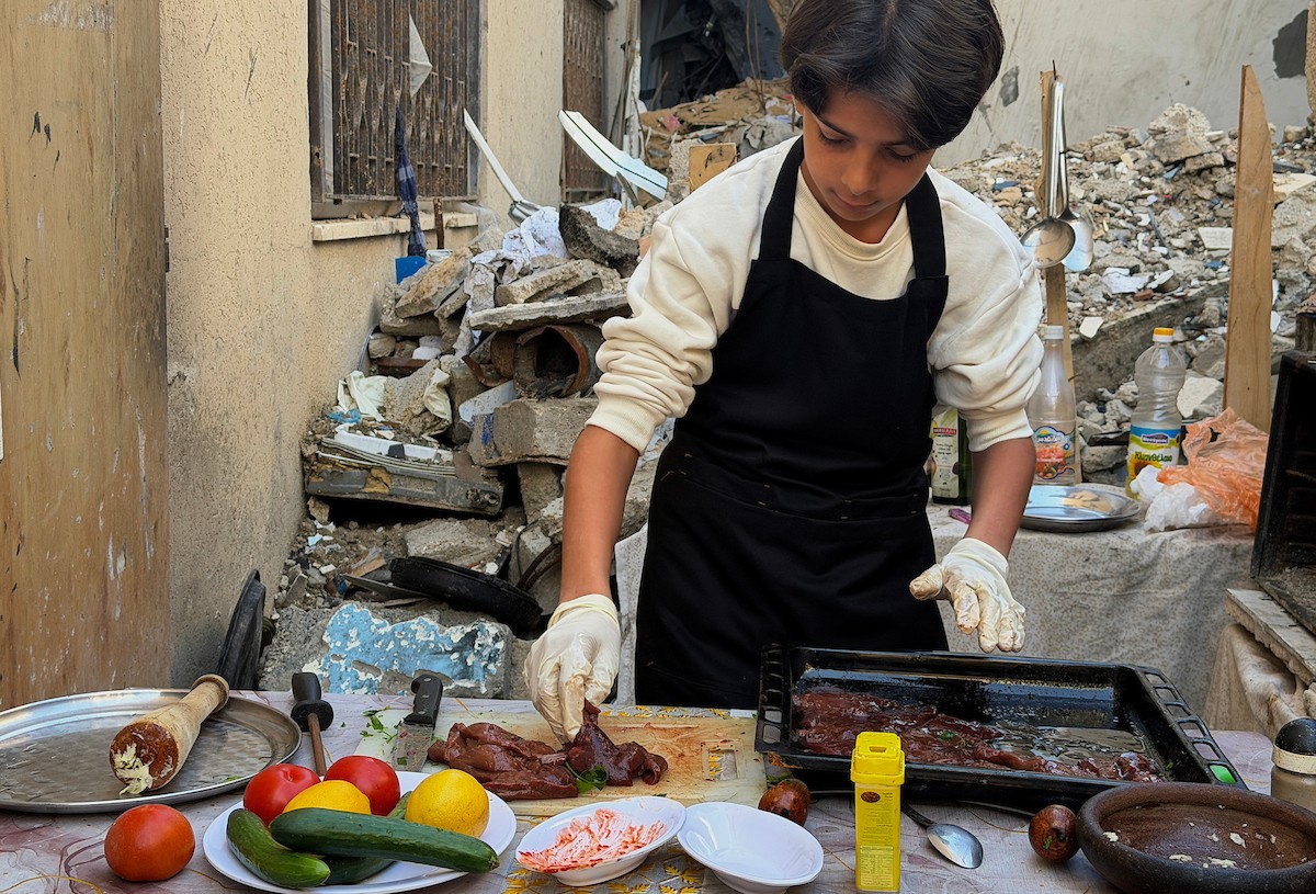 ياسر عياد، فتى فلسطيني (14عامًا) يمارس مهاراته في الطبخ على نار الحطب بجوار أنقاض منزل عائلته المدمر في مدينة غزة، 10أبريل/نيسان 2026. تصوير: محمد الأسود