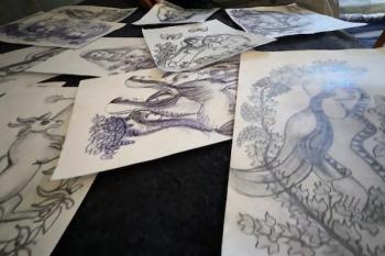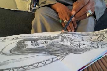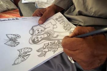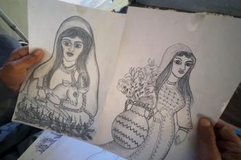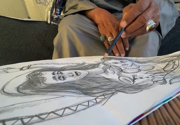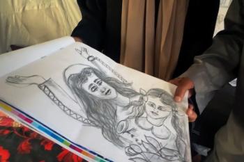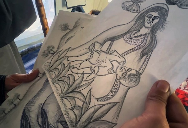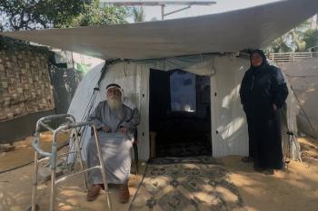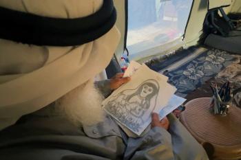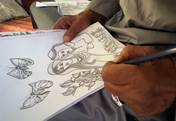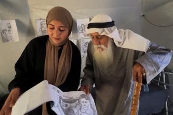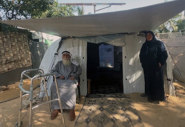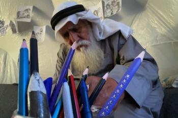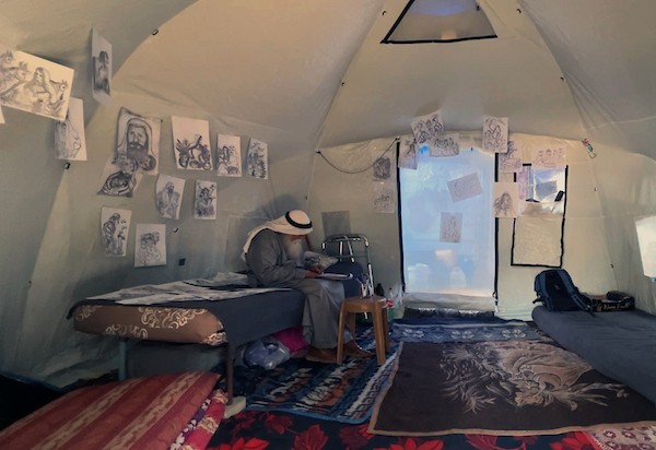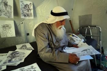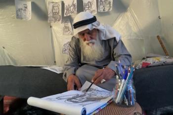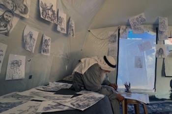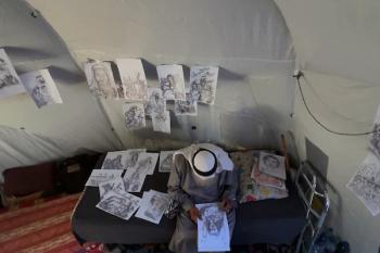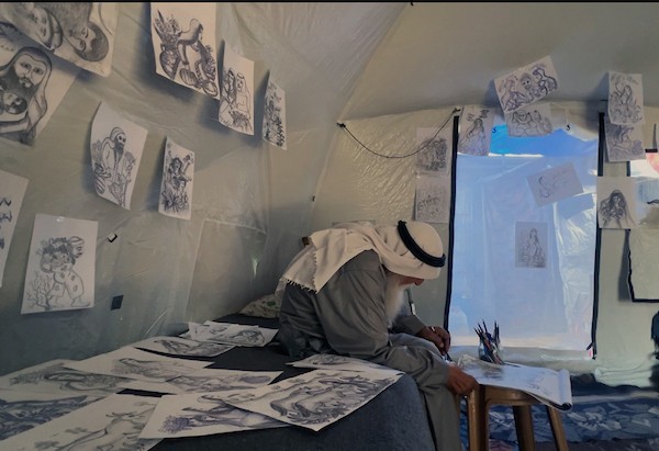 محمد زملط مسن فلسطيني اقتلعته الحرب من جباليا يحمل اليوم ريشته كوسيلة للبقاء، لا للفن فقط. في خيمته المتواضعة بمخيم البريج وسط قطاع غزة، تُصوّر أعماله معاناة الحرب بما في ذلك فقدانه لأبنائه، 12 أبريل/نيسان 2026، عدسة: يوسف أبو وطفة