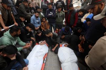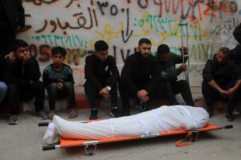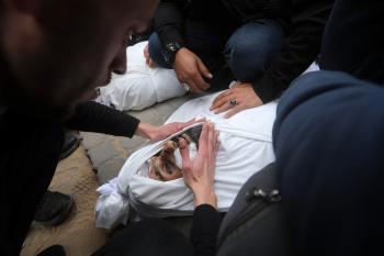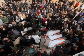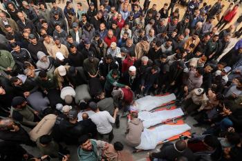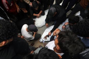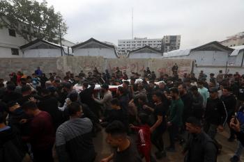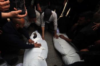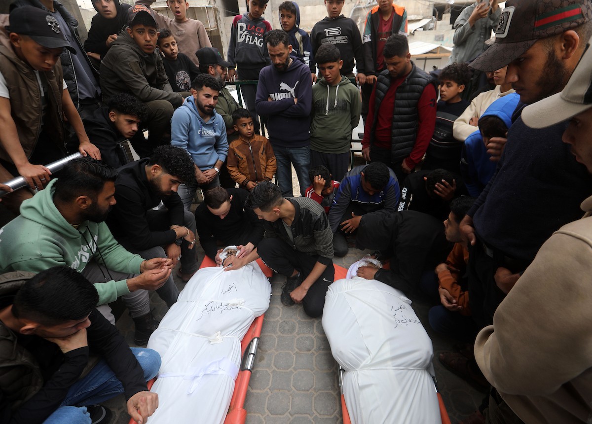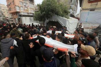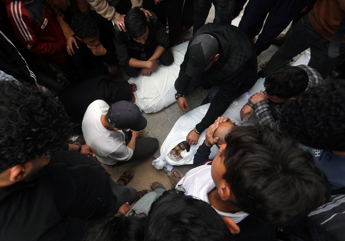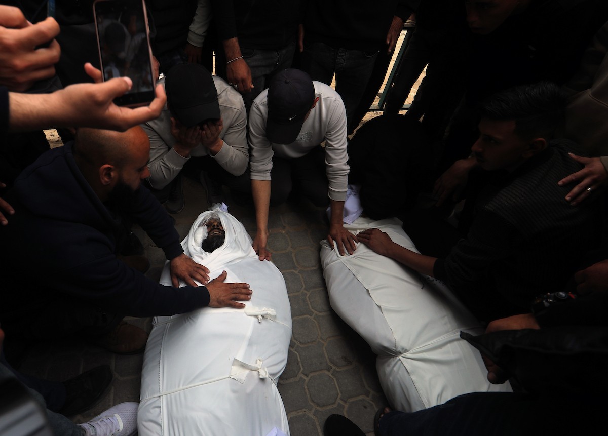 ودّع المشيّعون جثامين الفلسطينيين الذين سقطوا في غارة جوية إسرائيلية على مخيم الشاطئ للاجئين خلال جنازتهم في مدينة غزة في 15 أبريل/نيسان 2026. صورة: بلال أسامة