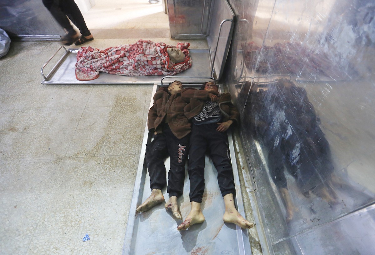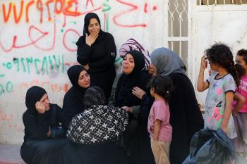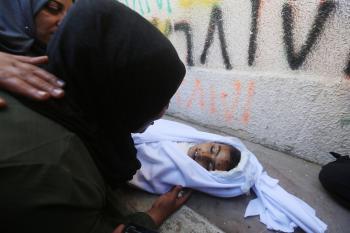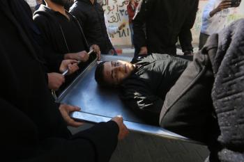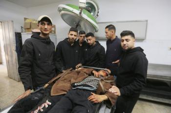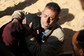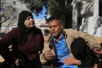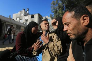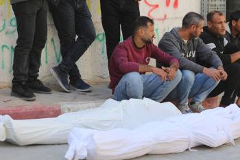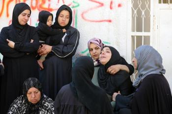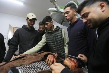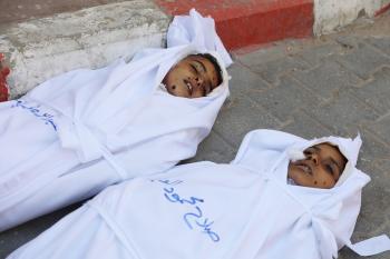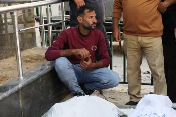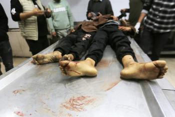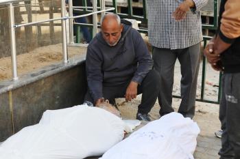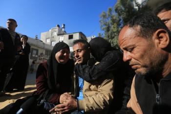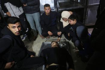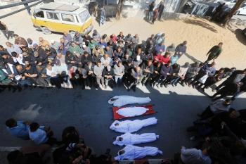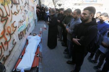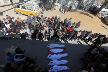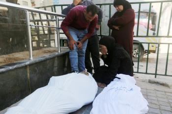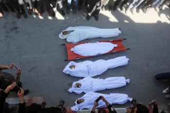 ودّع فلسطينيون جثامين خمسة مواطنين، بينهم ثلاثة أطفال، في مستشفى الشفاء بمدينة غزة. وكانوا قد سقطوا ليلة أمس في غارة جوية إسرائيلية استهدفت تجمعًا للمدنيين في منطقة بيت لاهيا شمال قطاع غزة. 23 أبريل/نيسان 2026. صورة: بلال أسامة