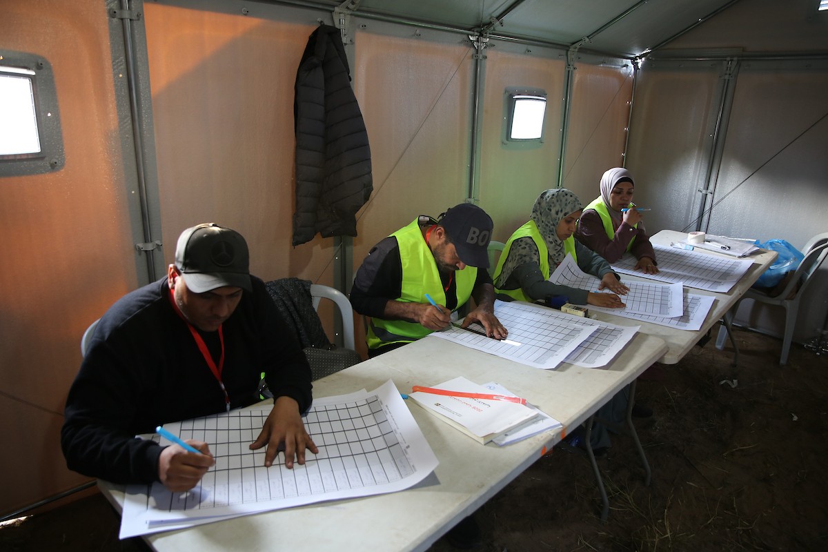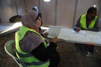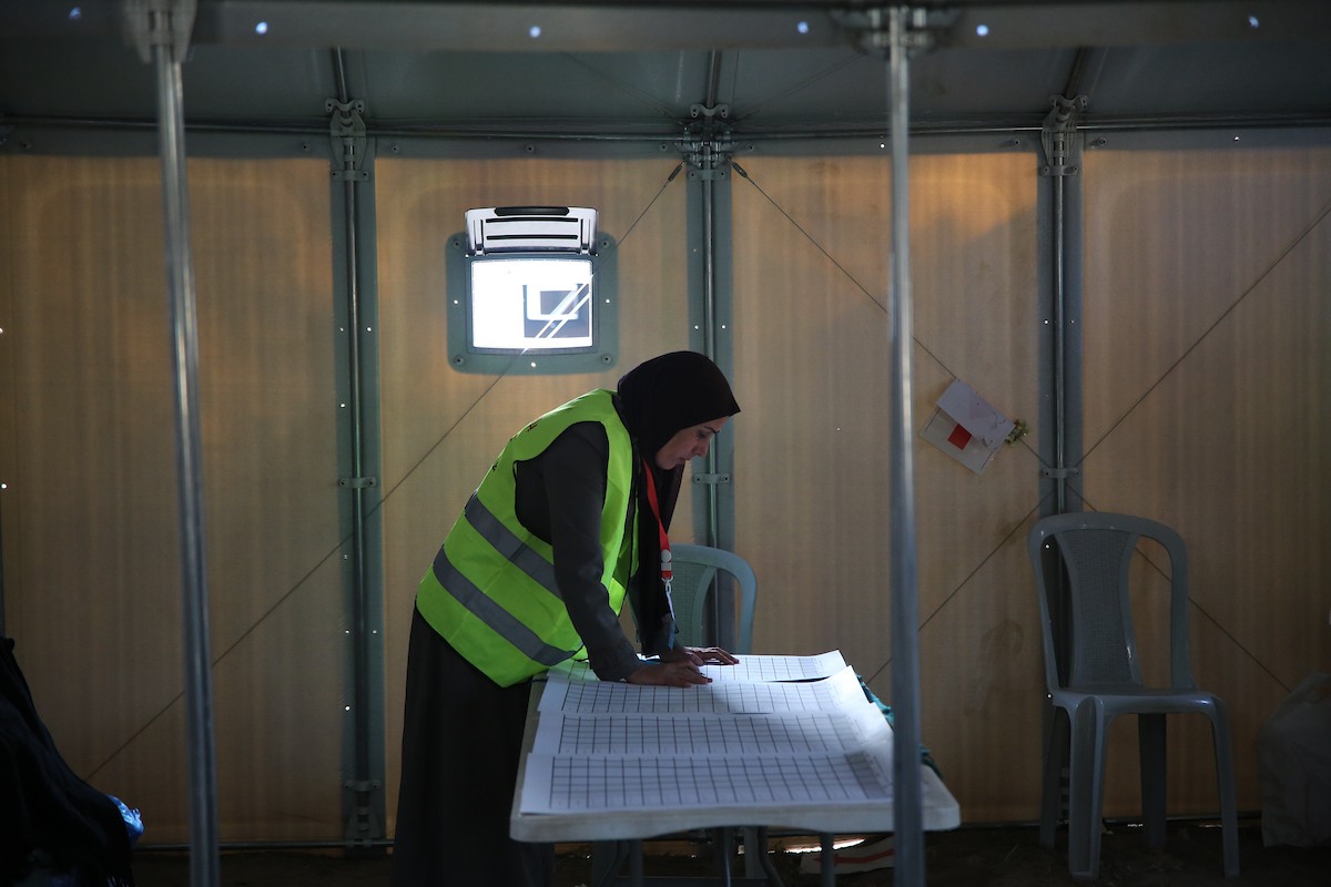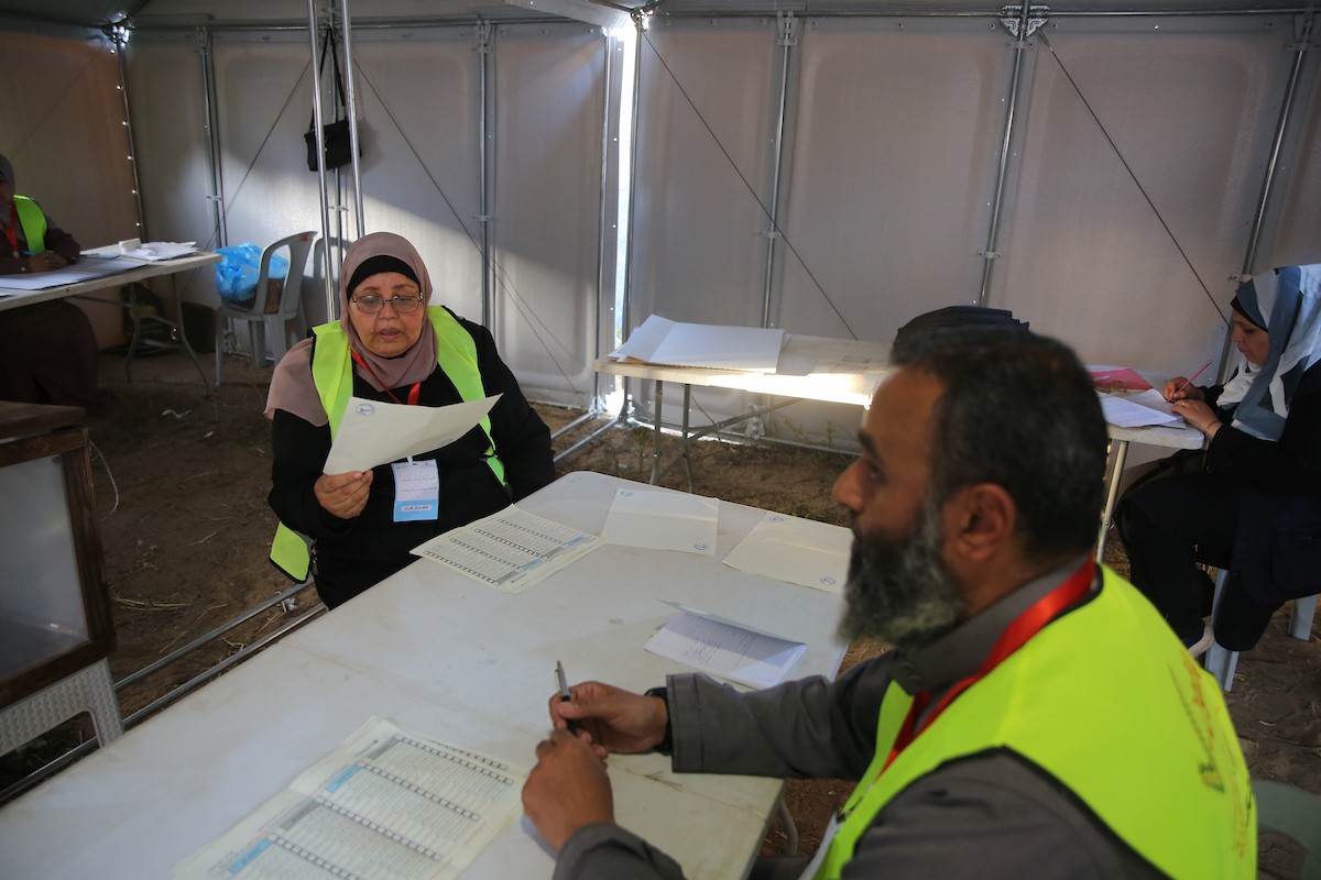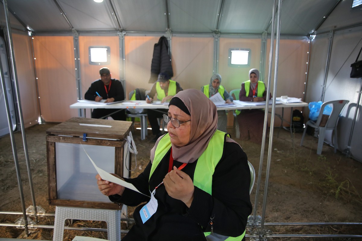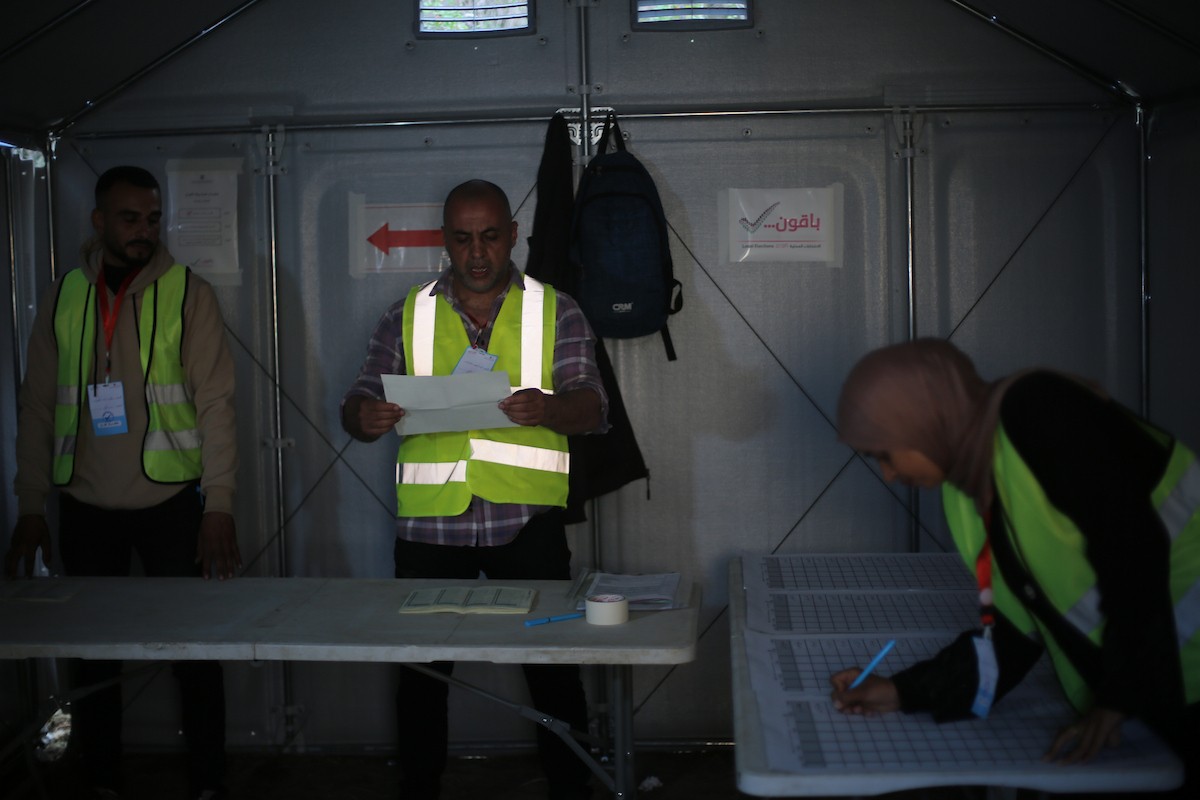 فرز أصوات الناخبين داخل مركز اقتراع في دير البلح، في 25 أبريل/نيسان 2026. وقد جرت الانتخابات البلدية اليوم في الضفة الغربية ووسط قطاع غزة، في أول انتخابات منذ بدء حرب غزة. (صورة: هادي داود)