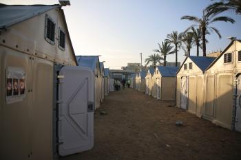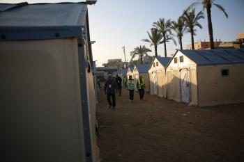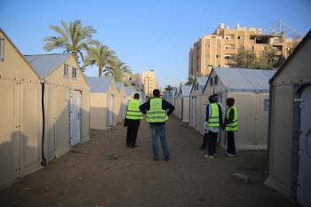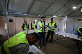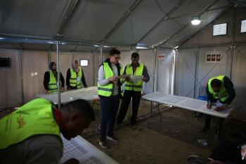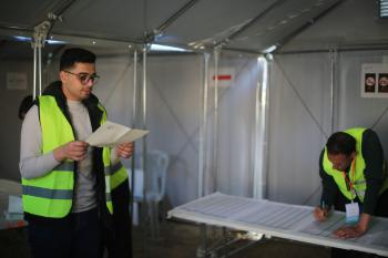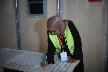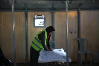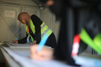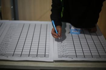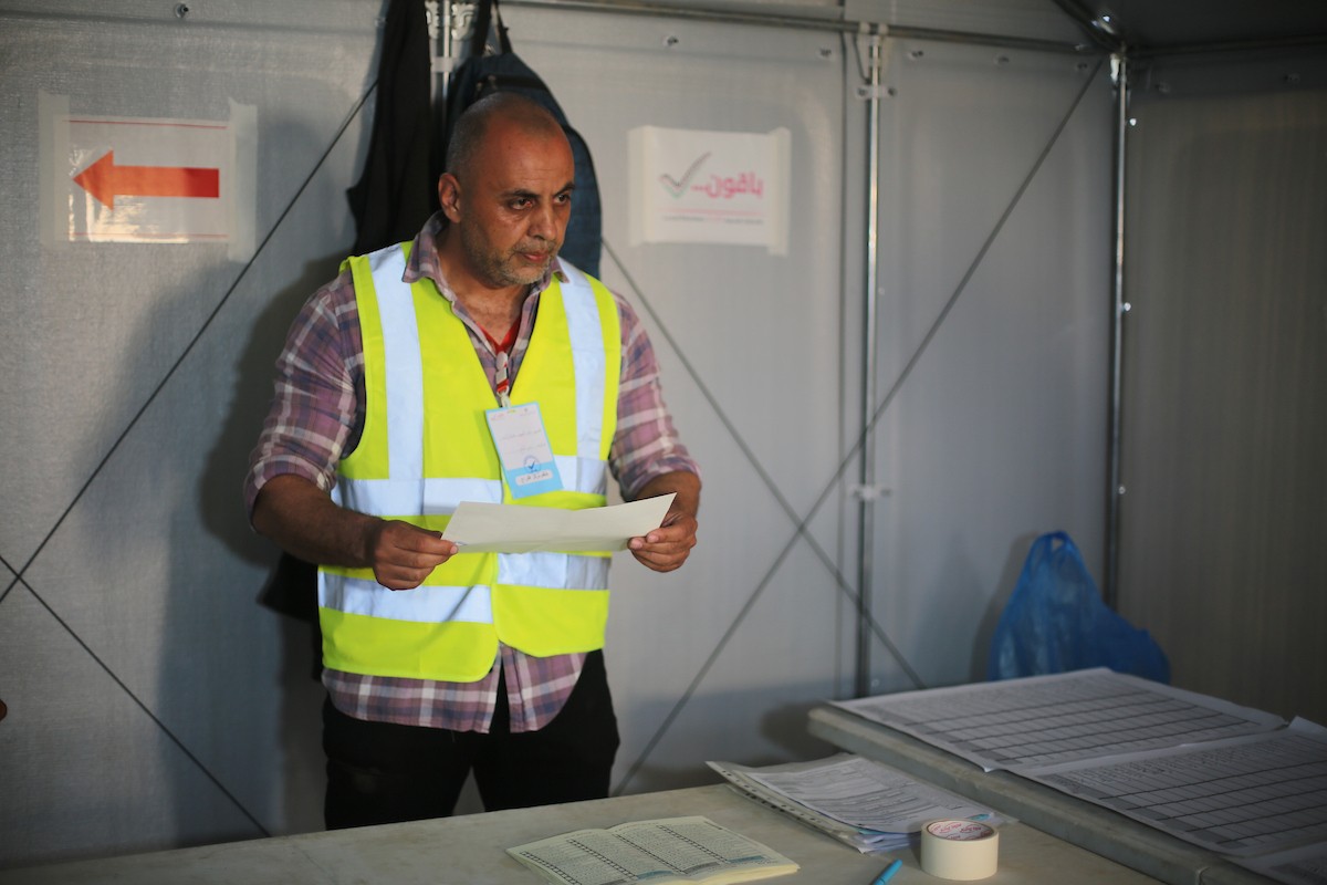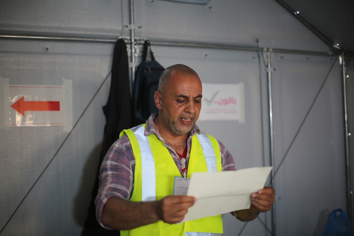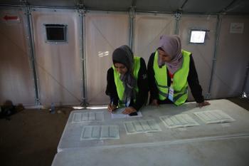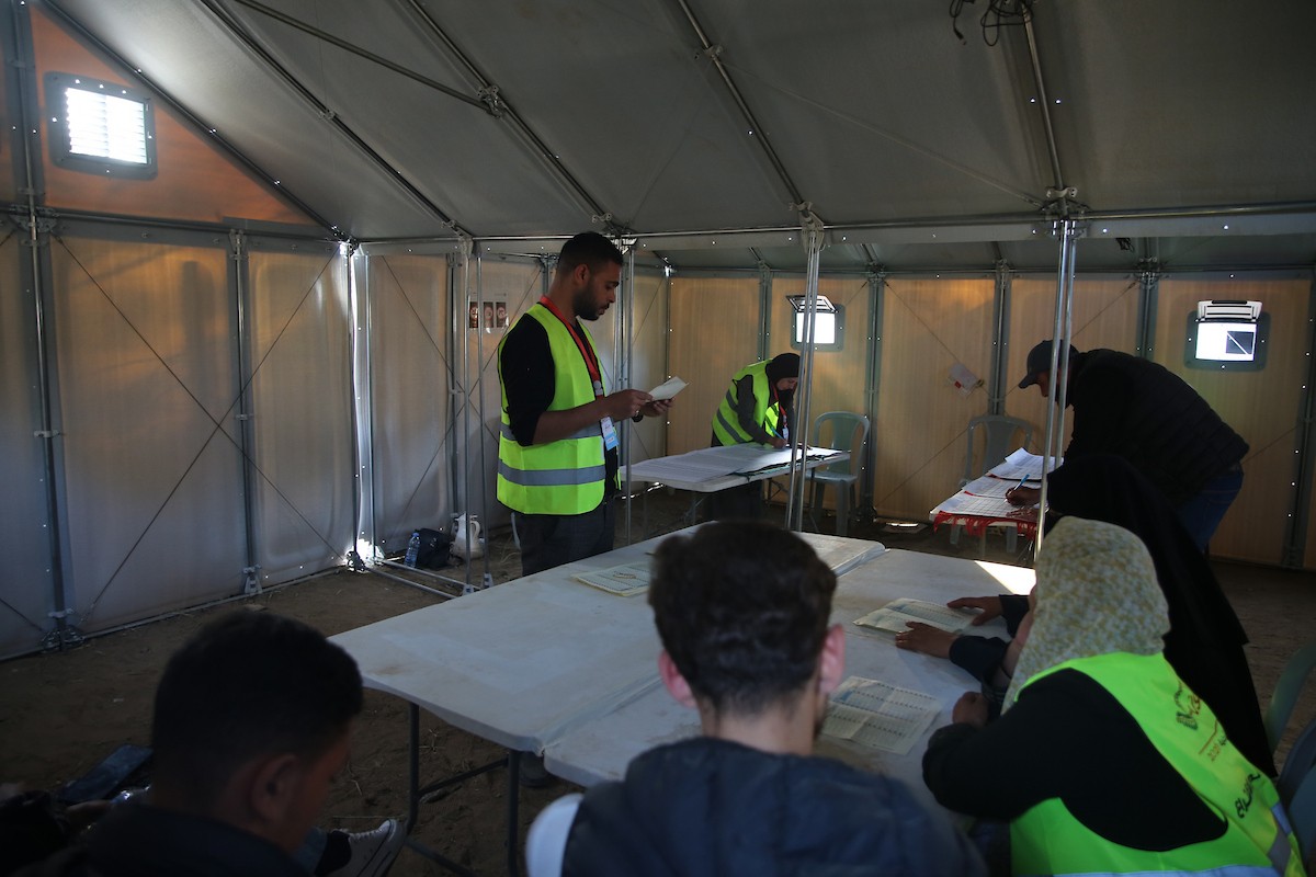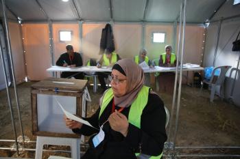 فرز أصوات الناخبين داخل مركز اقتراع في دير البلح، في 25 أبريل/نيسان 2026. وقد جرت الانتخابات البلدية اليوم في الضفة الغربية ووسط قطاع غزة، في أول انتخابات منذ بدء حرب غزة. (صورة: هادي داود)