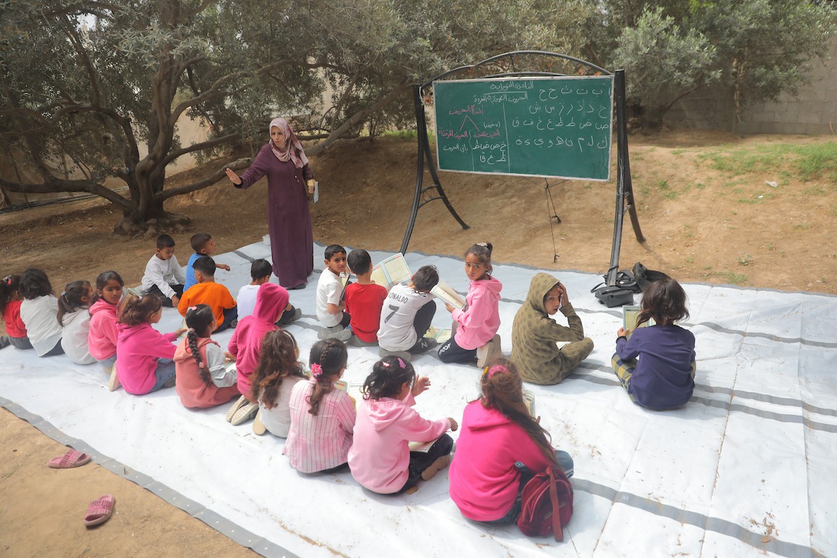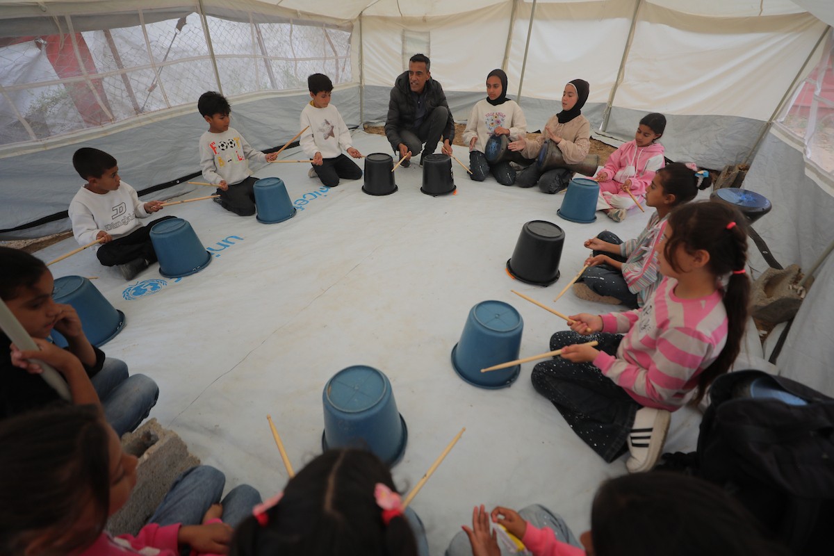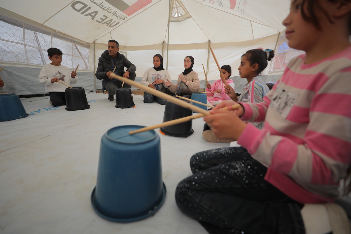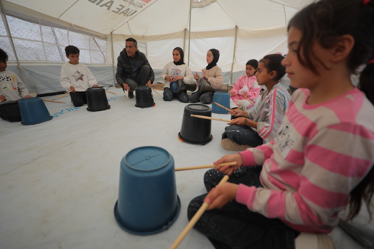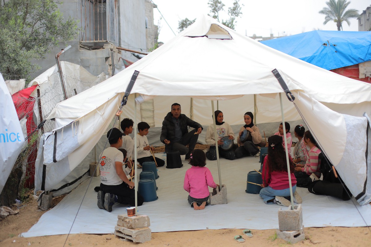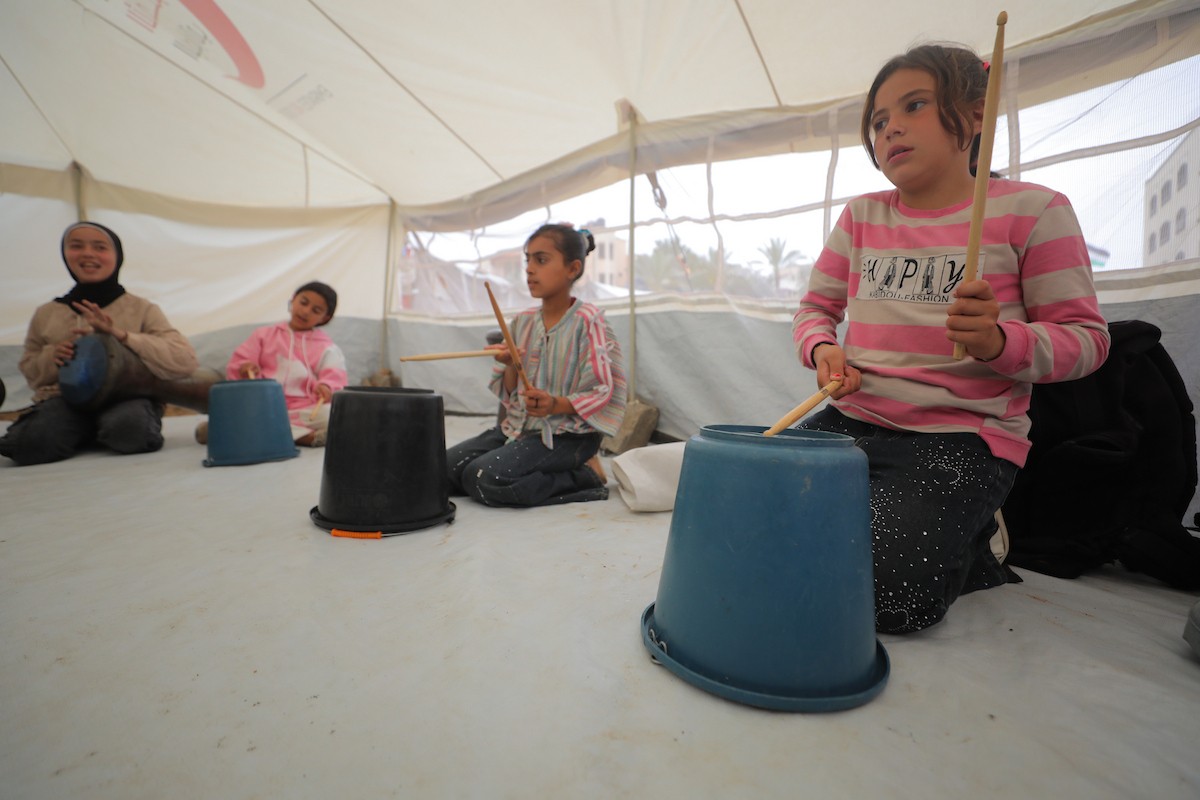 يشارك أطفال فلسطينيون في أنشطة ترفيهية ودعم نفسي اجتماعي في مخيم الزهور للنازحين في مخيم النصيرات للاجئين وسط قطاع غزة، 26 أبريل/نيسان 2026، (تصوير: حسن الجديدي)