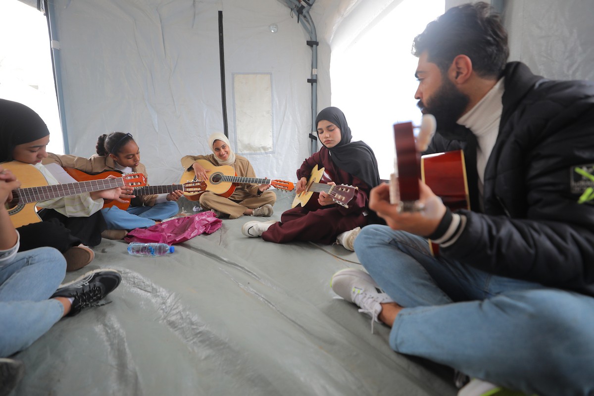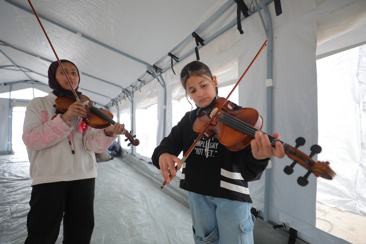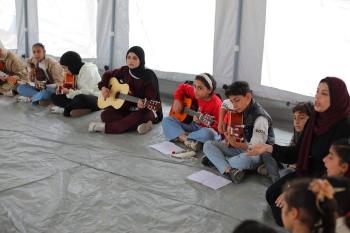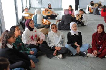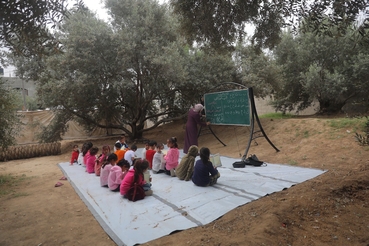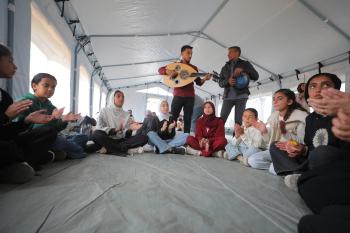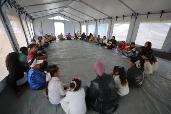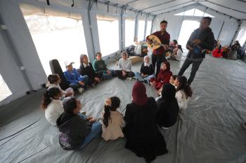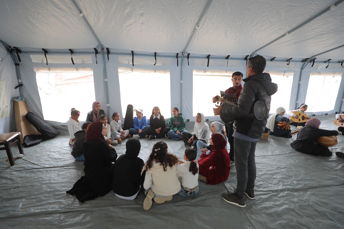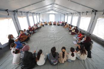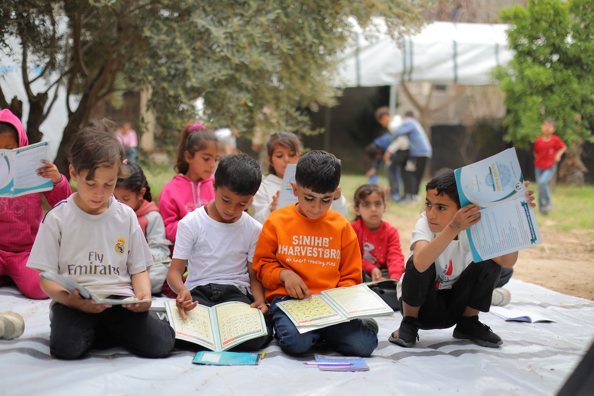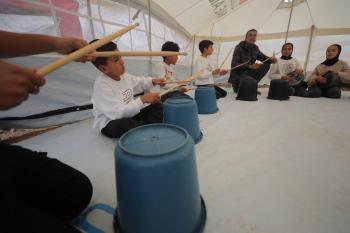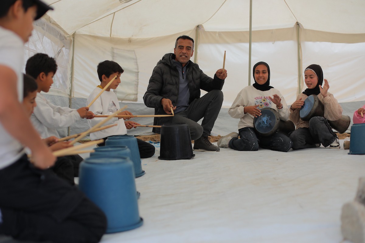 يشارك أطفال فلسطينيون في أنشطة ترفيهية ودعم نفسي اجتماعي في مخيم الزهور للنازحين في مخيم النصيرات للاجئين وسط قطاع غزة، 26 أبريل/نيسان 2026، (تصوير: حسن الجديدي)