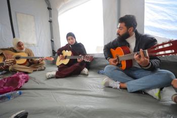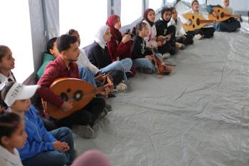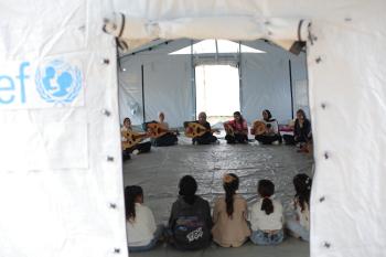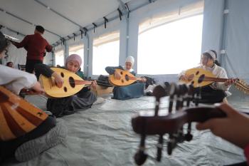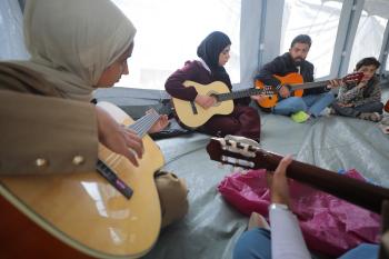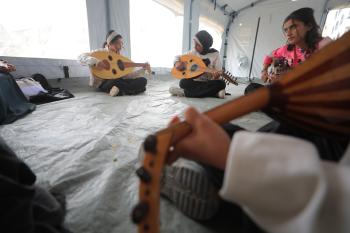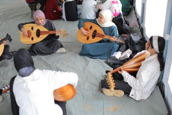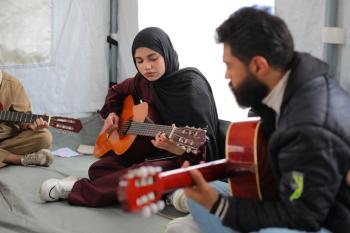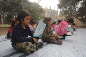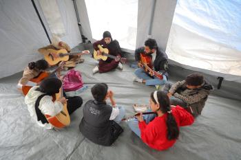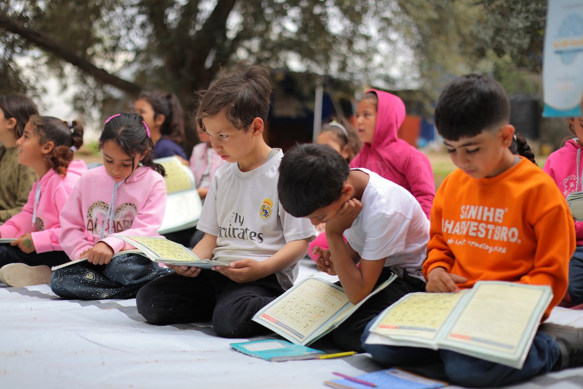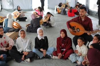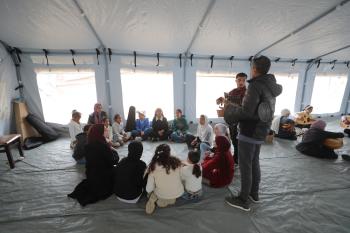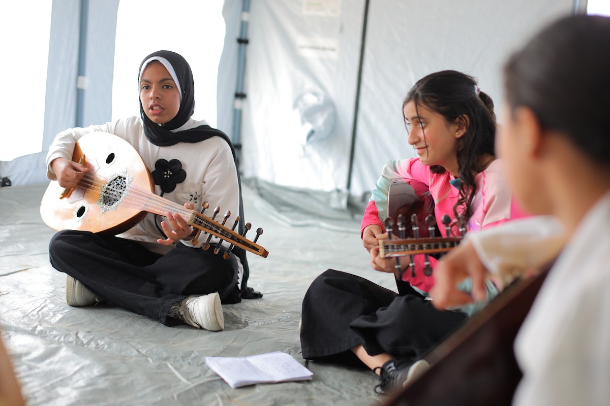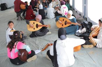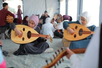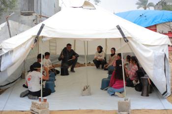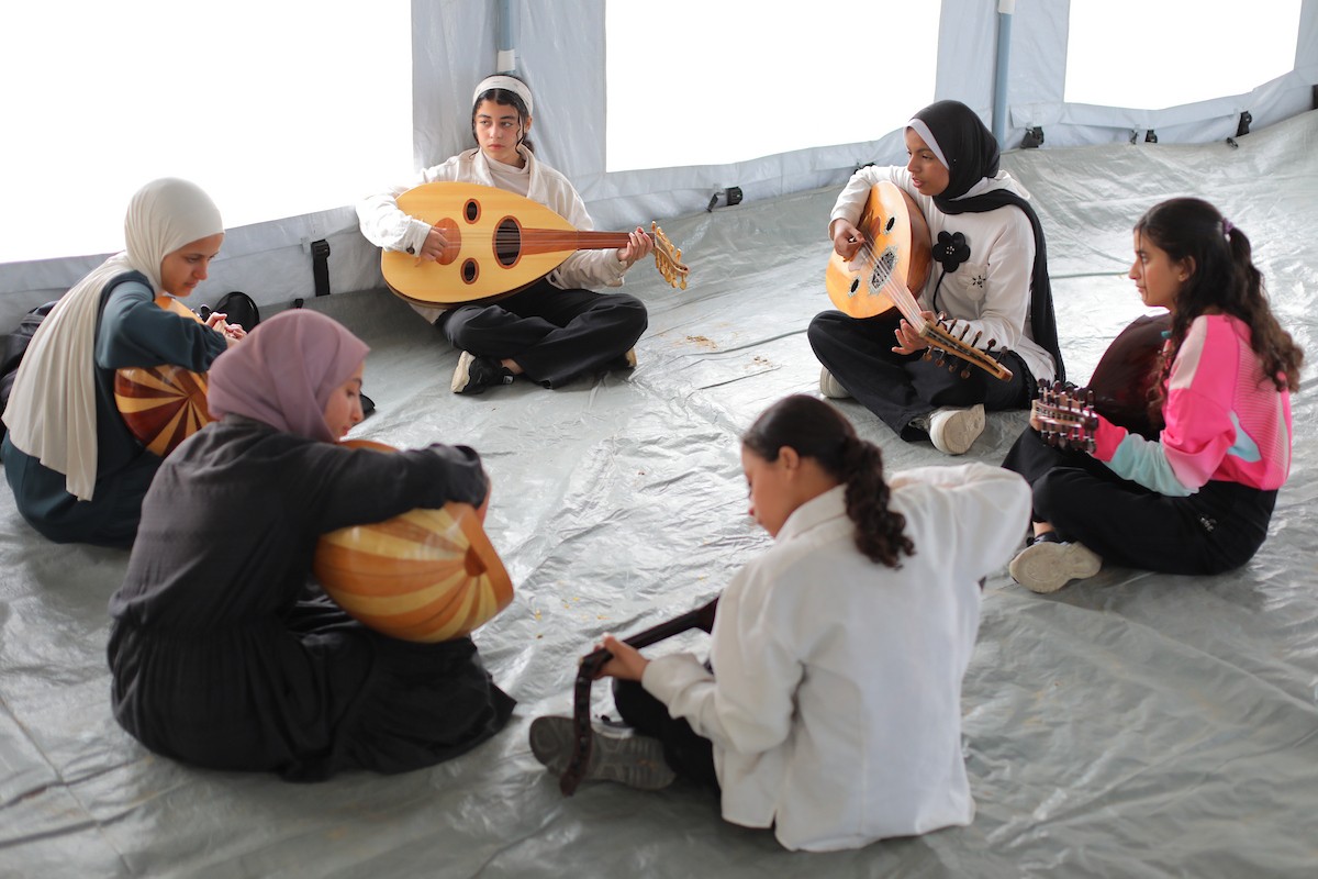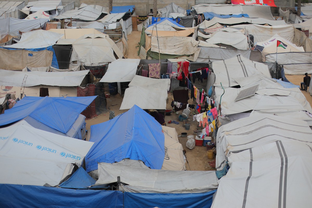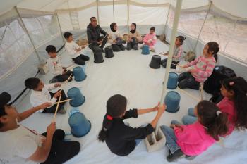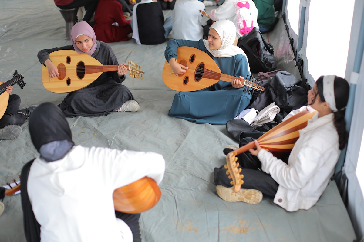 يشارك أطفال فلسطينيون في أنشطة ترفيهية ودعم نفسي اجتماعي في مخيم الزهور للنازحين في مخيم النصيرات للاجئين وسط قطاع غزة، 26 أبريل/نيسان 2026، (تصوير: حسن الجديدي)