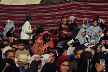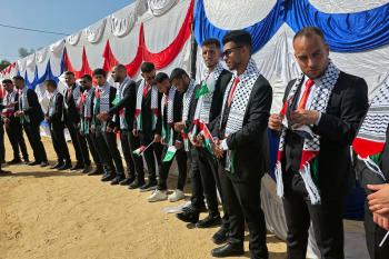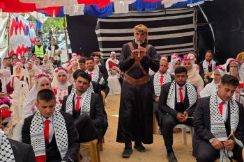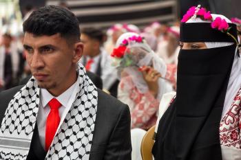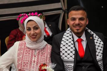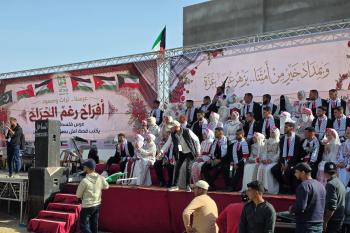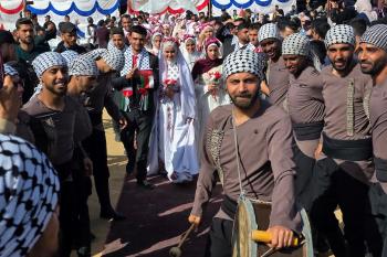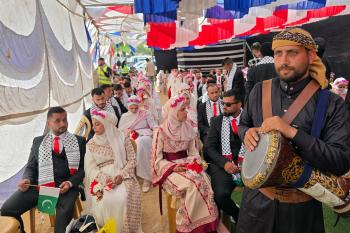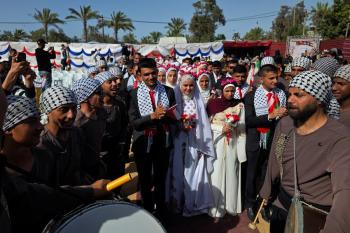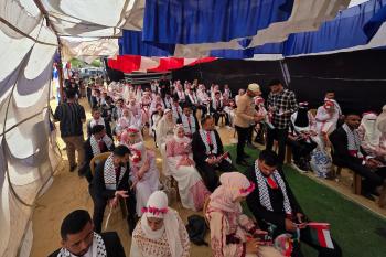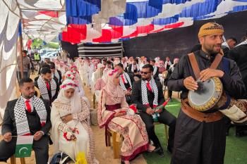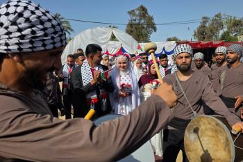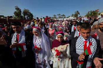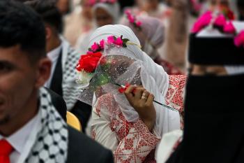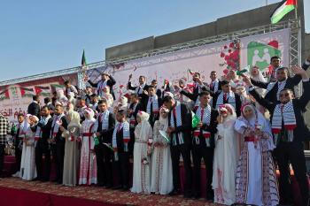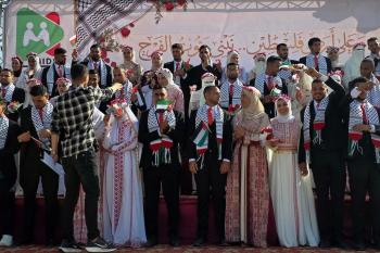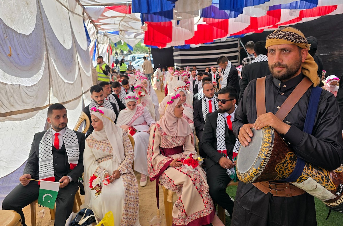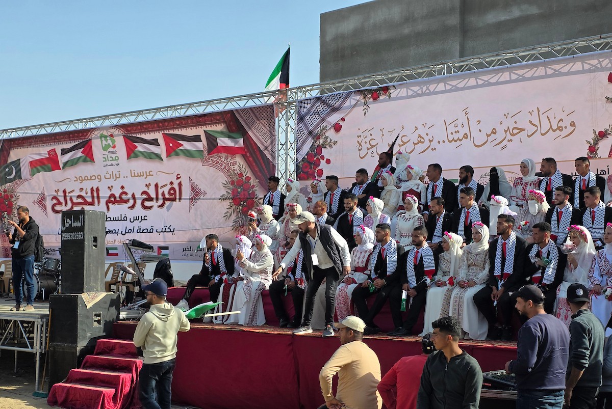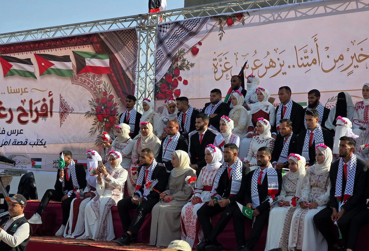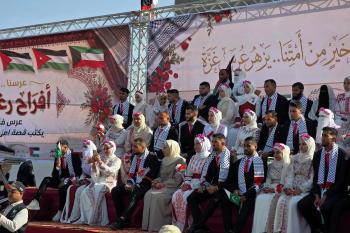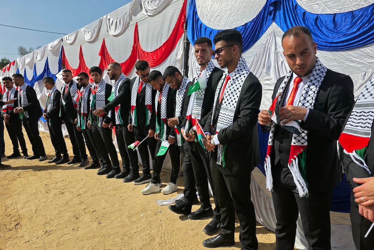 فلسطينيون يشاركون في حفل زفاف جماعي لخمسين عريساً فقدوا أفراداً من عائلاتهم خلال الحرب، ضمن مبادرة بعنوان "أفراح رغم الجراح"، في خان يونس، جنوب قطاع غزة. 26 أبريل/نيسان 2026. (تصوير: طارق محمد)