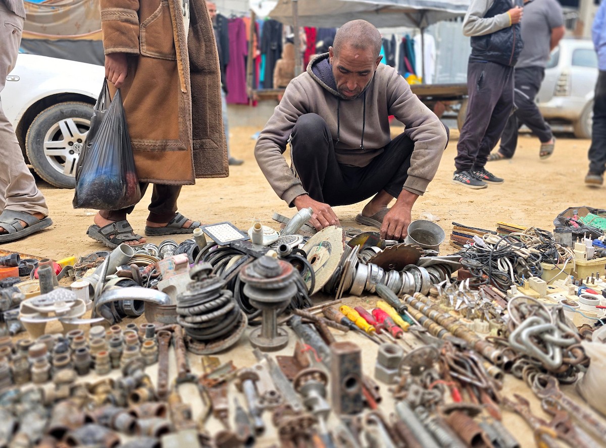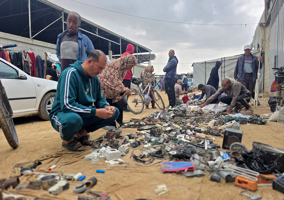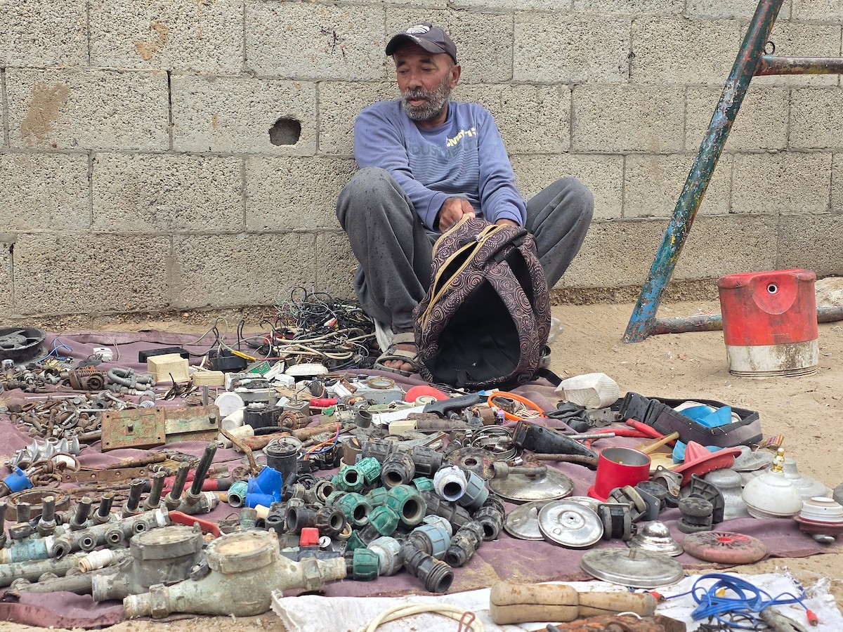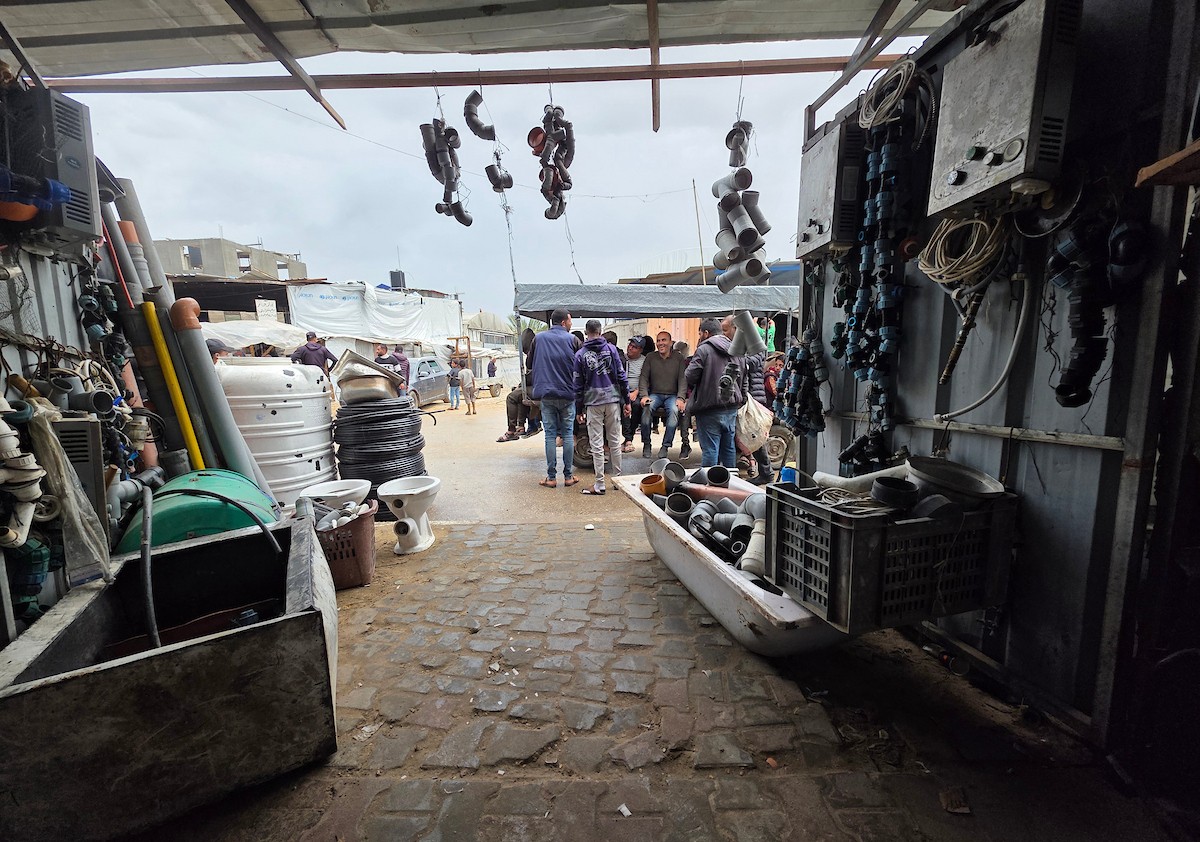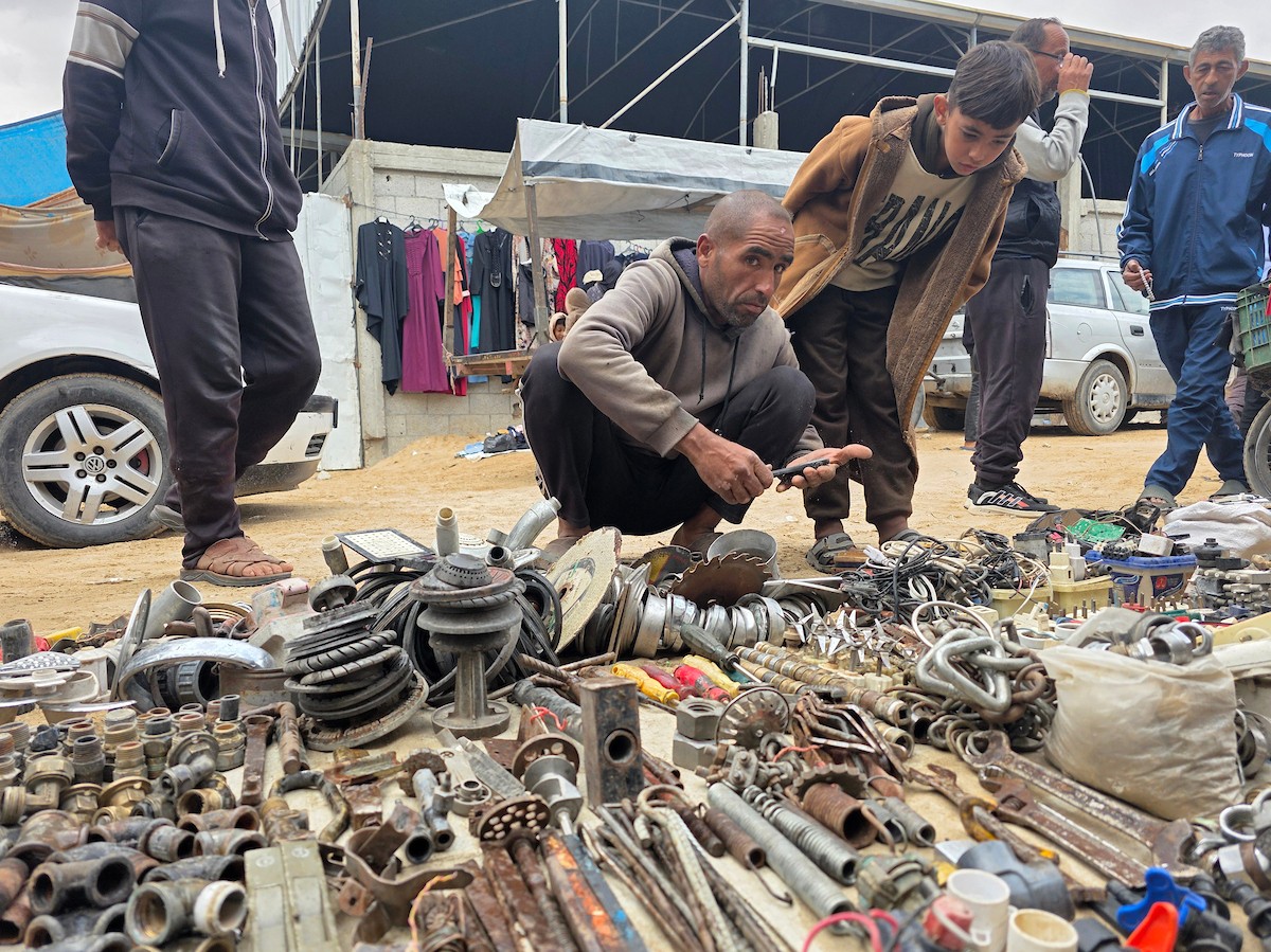 يبيع فلسطينيون موادًا مُستصلحة من أنقاض منازلهم المدمرة، بما في ذلك المعادن والخشب والأبواب ومستلزمات النظافة، في سوق للخردة بمنطقة المواصي في خان يونس جنوب قطاع غزة، في 27 أبريل/نيسان 2026 (صورة: طارق محمد)