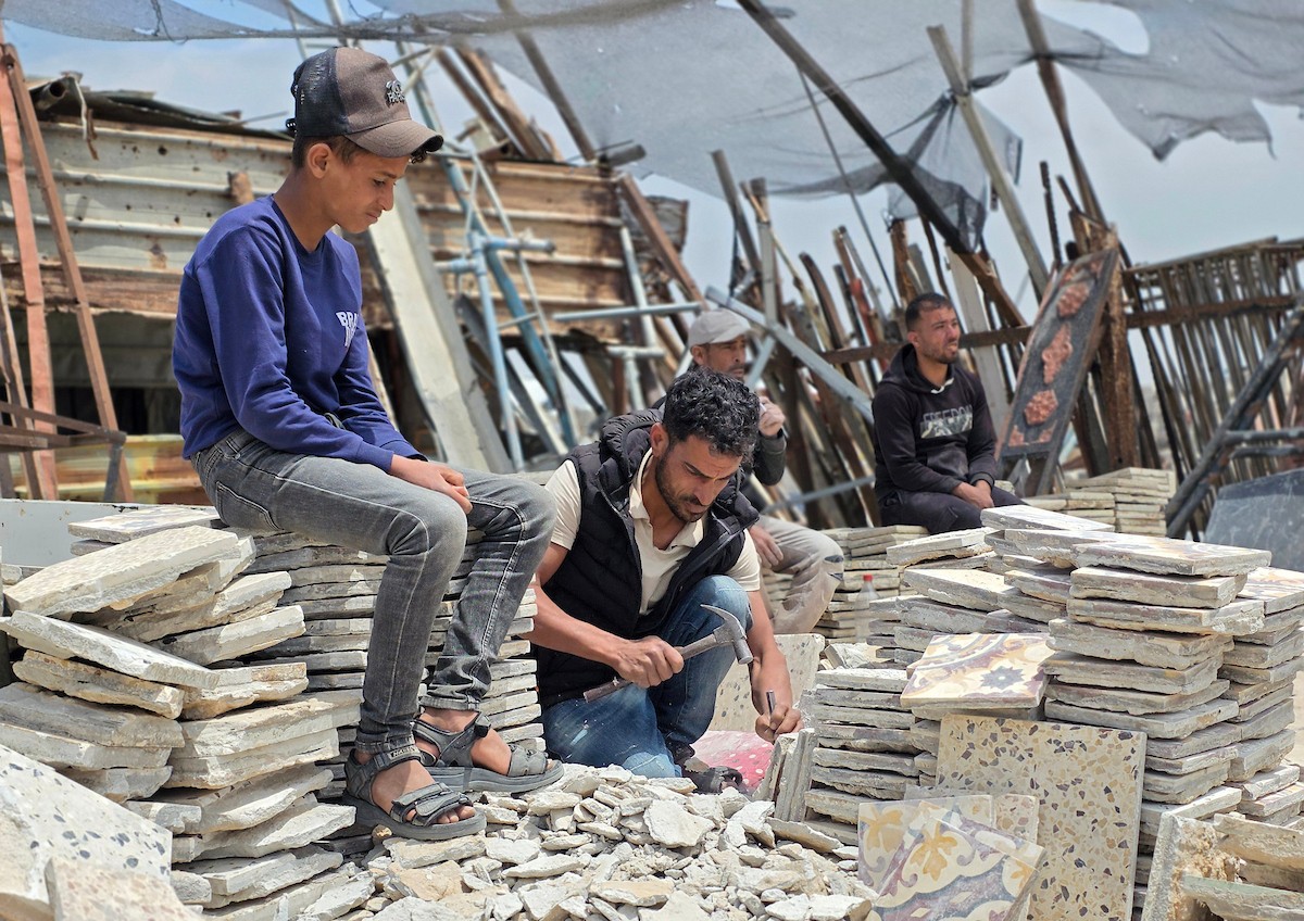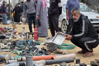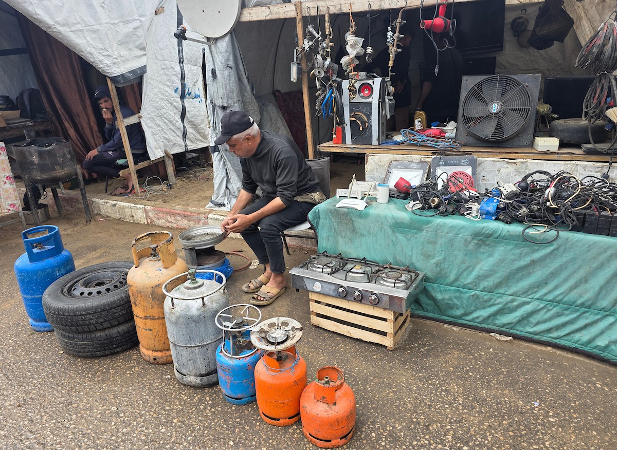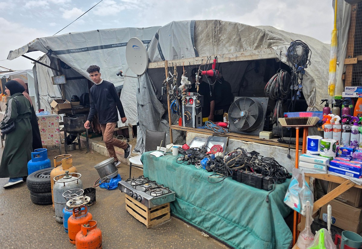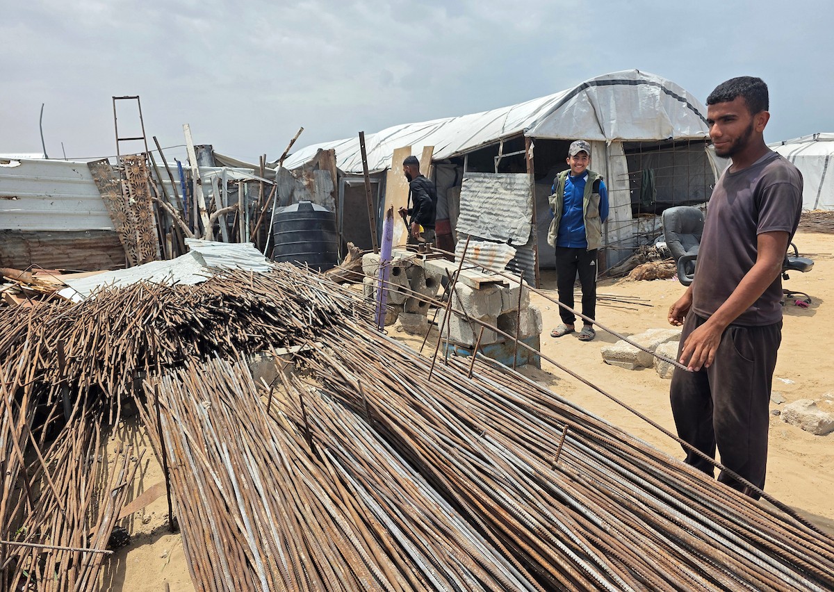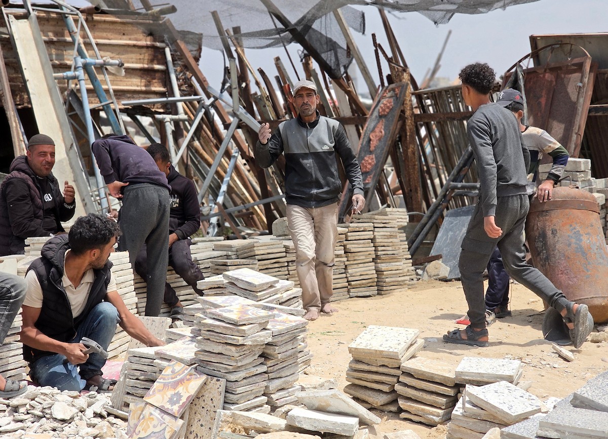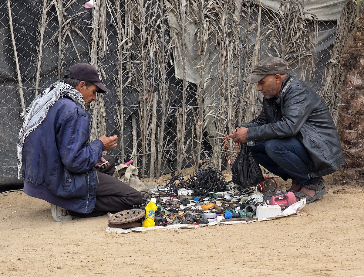 يبيع فلسطينيون موادًا مُستصلحة من أنقاض منازلهم المدمرة، بما في ذلك المعادن والخشب والأبواب ومستلزمات النظافة، في سوق للخردة بمنطقة المواصي في خان يونس جنوب قطاع غزة، في 27 أبريل/نيسان 2026 (صورة: طارق محمد)