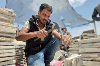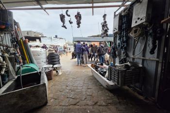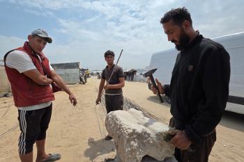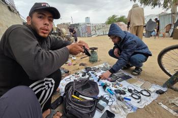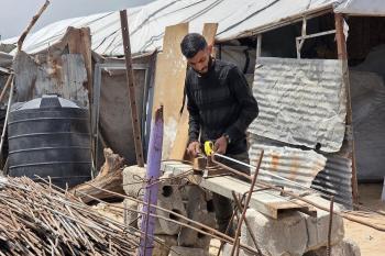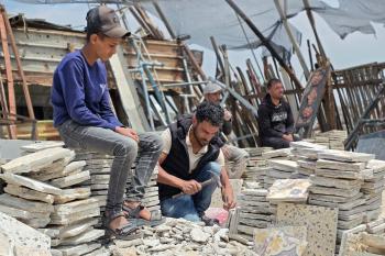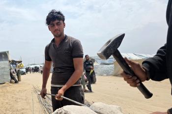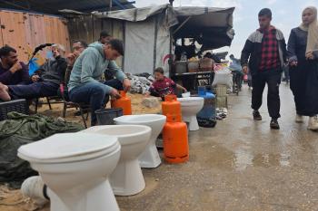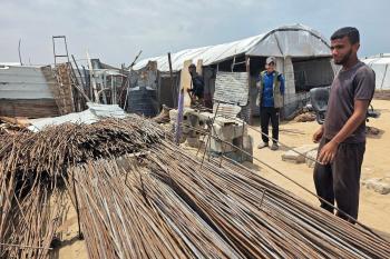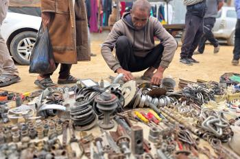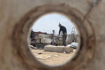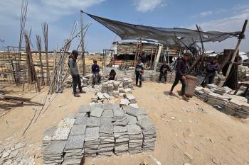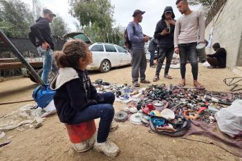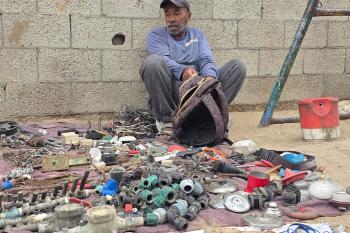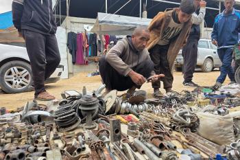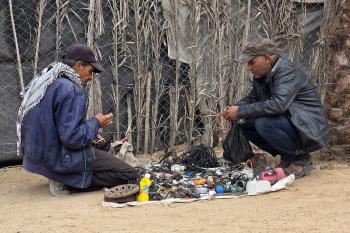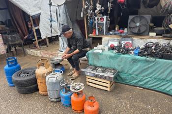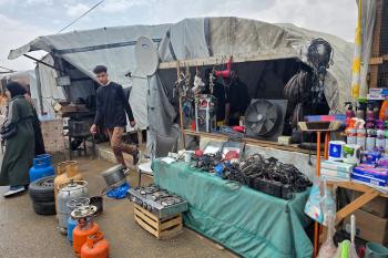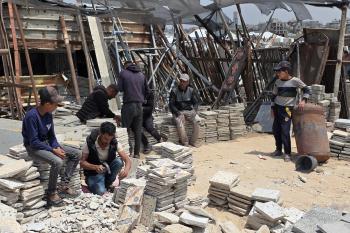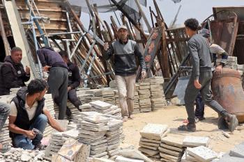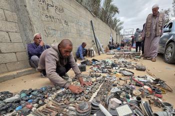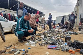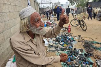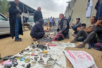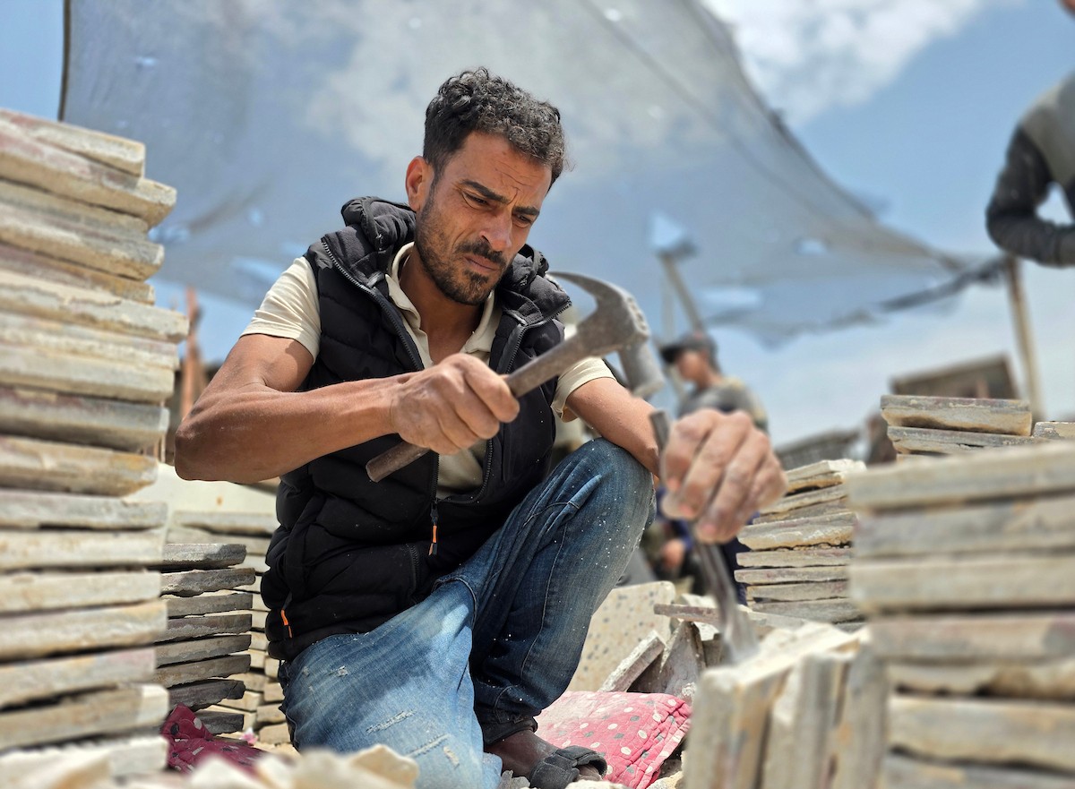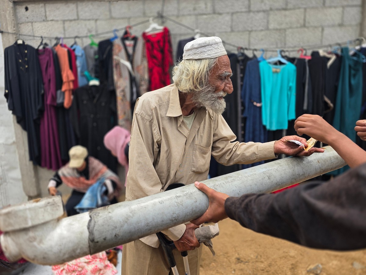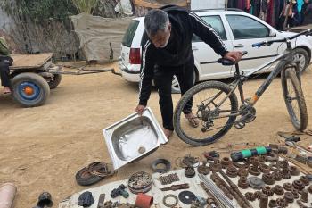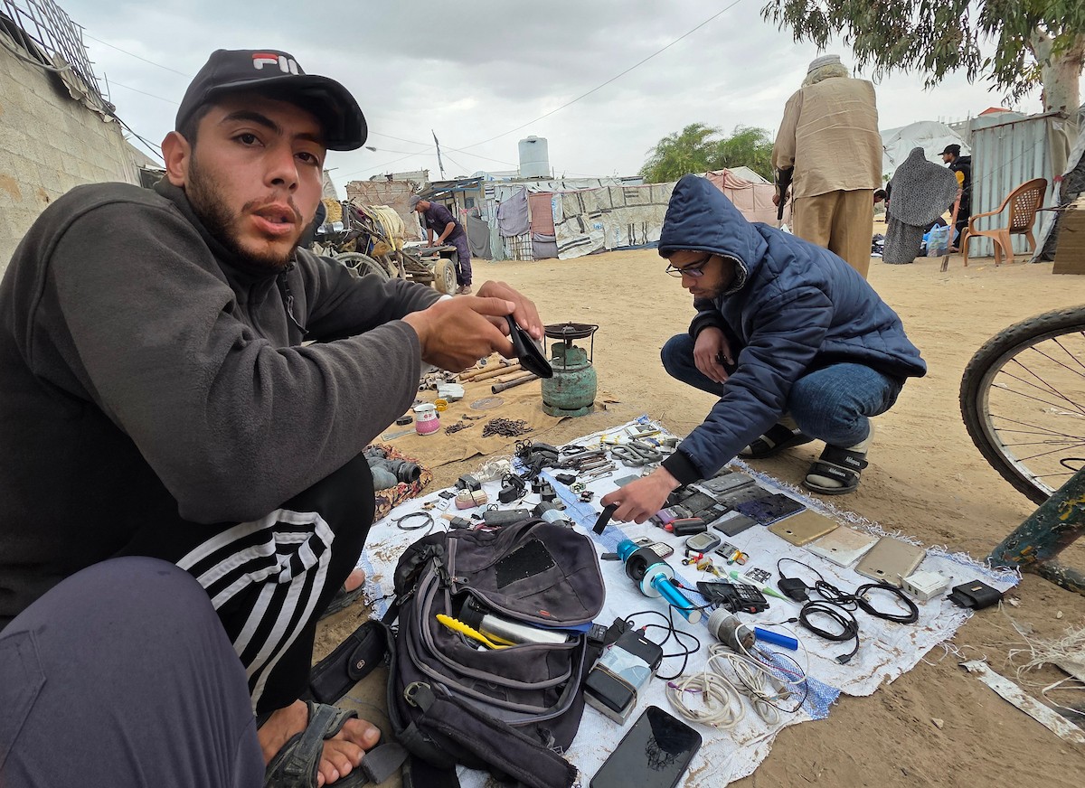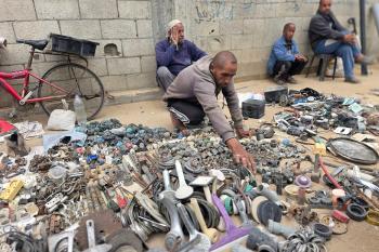 يبيع فلسطينيون موادًا مُستصلحة من أنقاض منازلهم المدمرة، بما في ذلك المعادن والخشب والأبواب ومستلزمات النظافة، في سوق للخردة بمنطقة المواصي في خان يونس جنوب قطاع غزة، في 27 أبريل/نيسان 2026 (صورة: طارق محمد)
