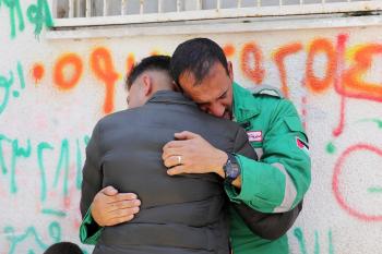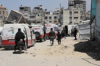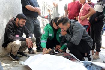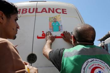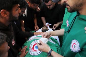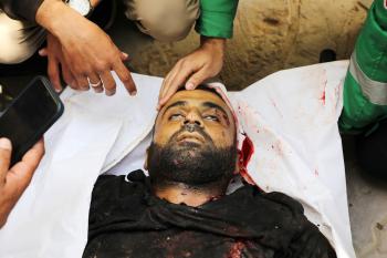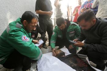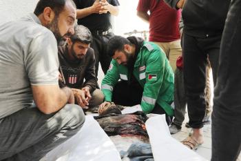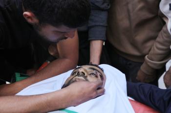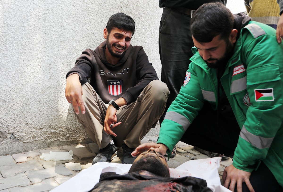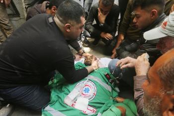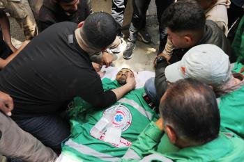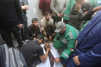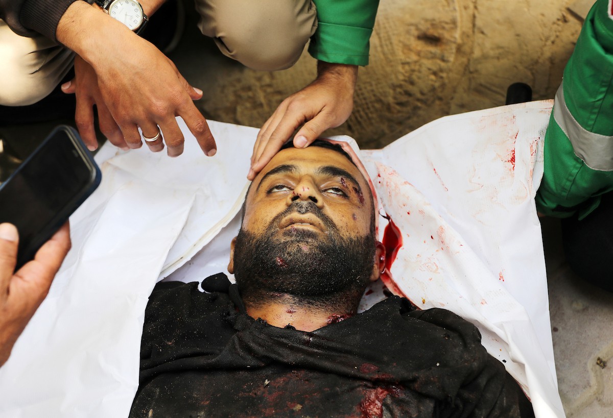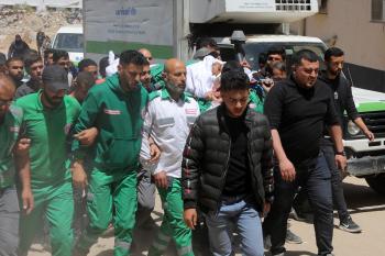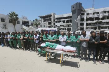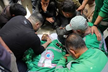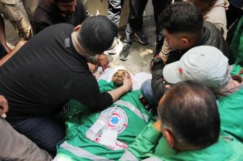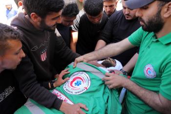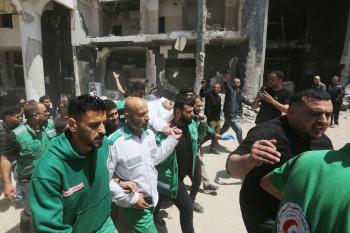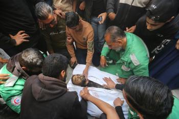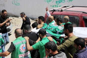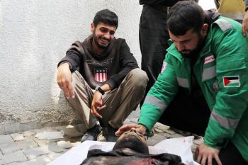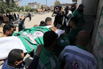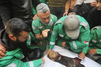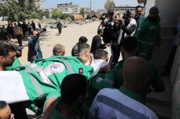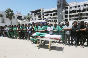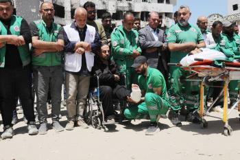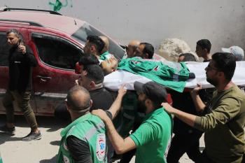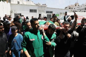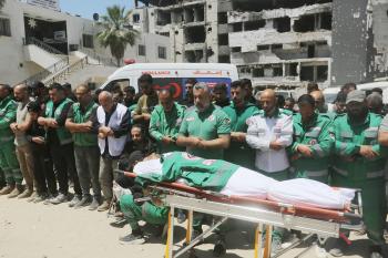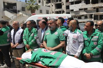 فلسطينيون يودعون جثمان المسعف إبراهيم صقر خلال جنازته في مستشفى الشفاء بمدينة غزة في 29 أبريل/نيسان 2026. ووفقًا لمدير إسعاف غزة والطوارئ، فارس عفانة، استُشهد صقر بعد استهدافه مباشرةً أثناء توجهه إلى عمله في منطقة التوام شمال قطاع غزة(صورة: بلال أسامة)