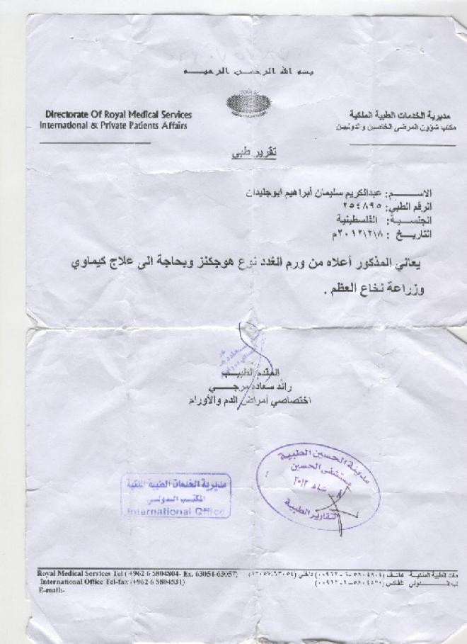 وأضاف قائلا بأنه "اضطر لمغادرة الأراضي الأردنية وترك علاجه الذي بدأ فيه " مشيرا إلى أنه يحتاج إلى زراعة نخاع العظم، إضافة إلى أنه يمتلك التقارير لما يثبت كلامه، والتي حصلنا على نسخة منها