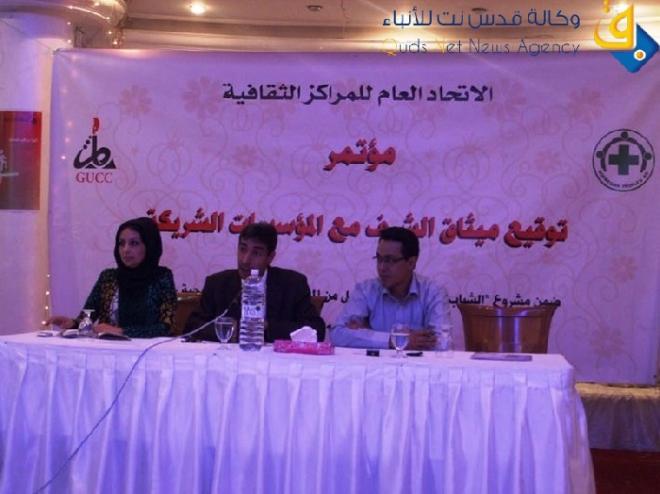 جاء ذلك خلال فعاليات ووقائع مؤتمر توقيع ميثاق الشرف مع المؤسسات الشريكة ضمن مشروع "الشباب هم المستقبل" والممول من جمعية المساعدات الشعبية النرويجية NPA والذي عقد في قاعة فندق جراند بالاس بتنظيم من الاتحاد العام للمراكز الثقافية بالتعاون مع 60 مؤسسة شريكه محلية في قطاع غزة .