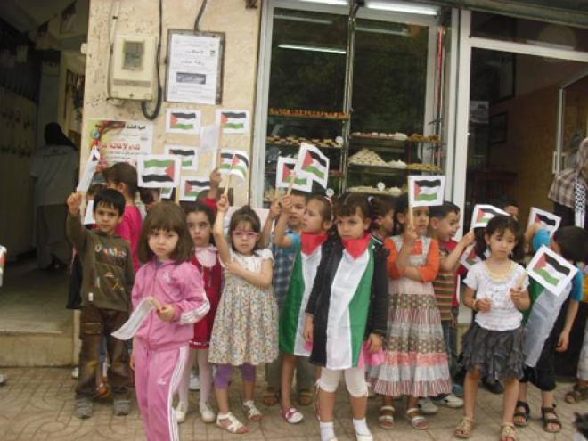 ورفع الأطفال الأعلام الفلسطينية، واللافتات التي تعبر عن التضامن مع فلسطين في الذكرى الخامسة والستين للنكبة، منها "من أشبال الجزائر يقين بعودة كل فلسطيني لأرضه، مطالبين بعودة اللاجئين الفلسطينيين إلى مدنهم وقراهم التي هجروا منه قسرا بفعل المجازر التي ارتكبتها "العصابات الصهيونية".