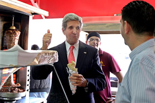 وتناول كيري في جولته "الشاورما" من أحد المطاعم الشعبية، واستمع إلى شرح من أصحاب المطعم حول طريقة إعدادها، كما تذوق الحلويات الفلسطينية، والقهوة العربية.