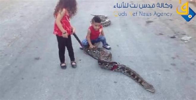 نشر نشطاء على مواقع التواصل الاجتماعي، تسجيلاً مصوراً يُظهر طفلة فلسطينية بصحبة أفعى ضخمة في مدينة رام الله وهى تقودها برفقة طفل دون أدنى خوف.