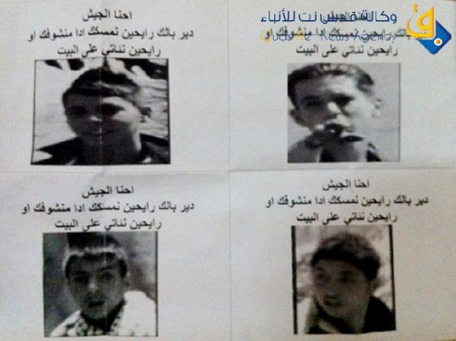 توعدت قوات الاحتلال الإسرائيلي أربعة أطفال من قرية كفر قدوم بمحافظة قلقيلية، بالاعتقال من خلال نشر صورهم على جدران المساجد وفي حارات القرية تتضمن عبارات تهديد بالاعتقال كتبت باللغة العربية.