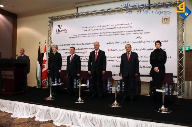 وشدد الحمد الله على جهود القيادة الفلسطينية وعلى رأسها الرئيس محمود عباس، في دعم الانجازات النوعية والهامة لمأسسة العلاقة مع القطاع الخاص، والضغط على المجتمع الدولي لإلزام اسرائيل بوقف كافة الانتهاكات بحق الشعب الفلسطيني، لتمكين كافة مؤسسات الدولة الفلسطينية من تلبية احتياجات الشعب، خاصة في القدس والاغوار والمناطق المسماة "ج" والتي تعتبر مجالا حيويا للعمل والاستثمار المحلي والدولي.