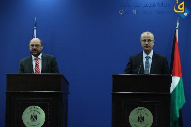 هذا وقد اجتمع الحمد الله مع رئيس البرلمان الاوروبي والوفد المرافق له، واطلعهم على تطورات الأوضاع السياسية والاقتصادية في فلسطين، وعلى الانتهاكات الإسرائيلية المتواصلة ضد الشعب الفلسطيني، والمتمثلة بتصعيد وتيرة الإستيطان، واستمرار الاجتياحات والتوغلات في المدن والبلدات الفلسطينية، ومواصلة نظام التحكم والسيطرة التعسفي، الذي يهدف إلى تعطيل قدرة الاقتصاد الفلسطيني على النمو، وتقويض عمل المؤسسات الوطنية في توفير الخدمات من خلال تقييد التجارة ومنع الاستثمار في أكثر من 60% من الأرض الفلسطينية المحتلة، وهي المناطق المسماة (ج) ومصادرة الموارد، وفرض الحصار على قطاع غزة.