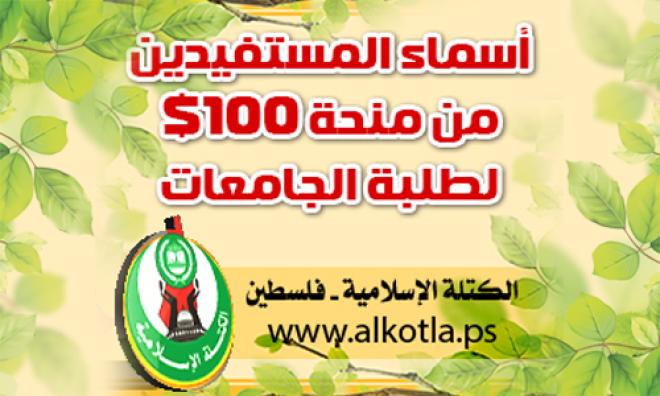 أعلنت الكتلة الإسلامية في قطاع غزة أنه سيتم ظهر اليوم الخميس نشر أسماء المستفيدين من منحة الـ 100 دولار والتي ستقدمها الكتلة الإسلامية لـ 2000 طالب وطالبة بمختلف جامعات وكليات القطاع .