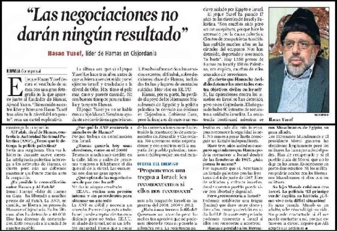 وذكرت الصحيفة المهتمة بالشأن العربي والفلسطيني الاسرائيلي خلال مقابله مع القيادي البارز في حركة حماس بالضفة الغربية حسن يوسف الاسبوع الفائت حول توقف العمليات ضد المدنيين الاسرائيلين قوله " نعم، العمليات ضد "المدنيين الاسرائيليين" في إسرائيل توقفت، لكن لم تتوقف في الضفة، في العام الماضي وقعت 90 محاولة اسر لجنود اسرائيليين، والمقاومة مستمرة طالما هناك احتلال". في اشارة الى عدم التوقف عن استهداف العسكريين الاسرائيليين في الضفة الغربية.