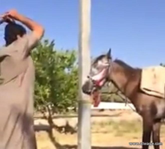 في مشهد مؤلم، أظهر مقطع فيديو متداول شخصاً يقوم بتعذيب "حصان" وضربه بعصا على رأسه.