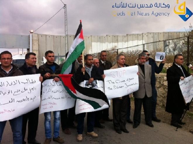 وشارك في الوقفة الاحتجاجية ممثلين عن نقابة الصحافيين ووزارة الاعلام رافعين الاعلام الفلسطينية والافتات المنددة بالاعتداء، ومن ثم المشاركين في الوقفة الى مدخل بيت لحم الشمالي، على الحاجز العسكري الفاصل عن مدينة القدس المحتلة رافعين الاعلام الفلسطينية والافتات المنددة بالاعتداء على الصحافيين".
