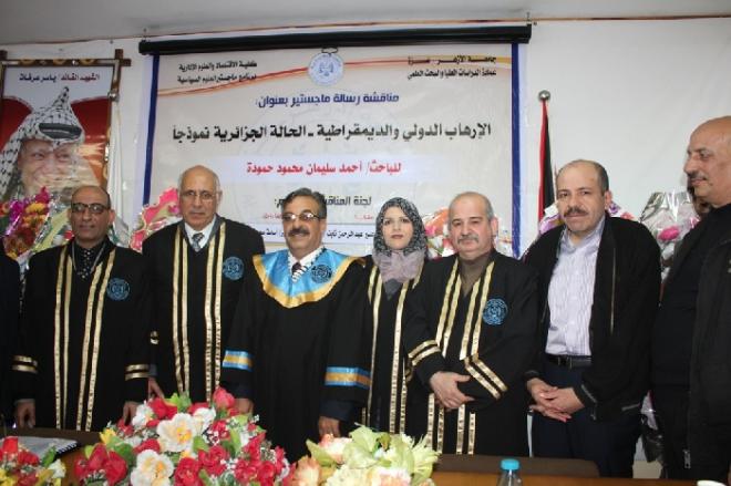 جاءت تلك الدراسة خلال مناقشة رسالة ماجستير في العلوم السياسية اليوم، للباحث أحمد سليمان حمودة بعنوان، "الإرهاب الدولي والديمقراطية- الحالة الجزائرية نموذجاً" في برنامج الدراسات العليا لجامعة الأزهر بغزة، والتي بموجبها منحت له درجة الماجستير من قبل لجنة المناقشة والحكم والتي تضم كل من الأستاذ الدكتور رياض العيلة مشرفاً ورئيساً، الدكتور عبير ثابت مشرفاً، الاستاذ الدكتور أسامة أبو نحل مناقشاً داخلياً والأستاذ الدكتور رفيق المصري مناقشاً خارجياً.