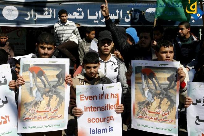 ورفع المشاركون لافتات كتب عليها: "أهلنا المسلمون في أفريقيا الوسطى والله لن يترككم ربنا، و"قطع الرؤوس لن يقطع الإسلام"، و"دولة الإسلام من وسط المحن والشدائد يبزغ فجرها"، و"فلسطين وأهلها تحمل همكم أيها المسلمون، ولن تبخل عنكم حتى بدماء أبنائها"، و"بورما بالأمس واليوم أفريقيا الوسطى والمسلمون والعرب نائمون، مهما اشتد البلاء فالإسلام قادم".