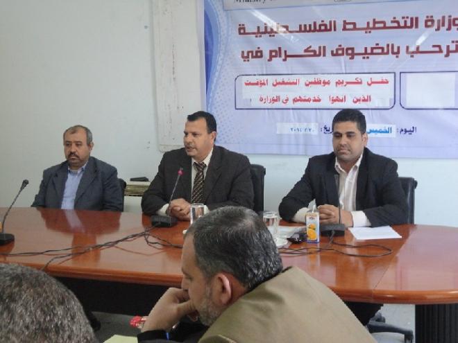 نظمت وزارة لتخطيط في الحكومة بغزة، حفلا لتكريم الموظفين الذين عملوا في الوزارة لمدة 11 شهرا ضمن برنامج التشغيل المؤقت وذلك بمقر الوزارة وبحضور وكيل الوزارة وجميع كافة موظفي الوزارة القدامى .