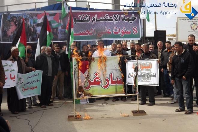 جاء ذلك خلال وقفة تضامنية للنقابات المهنية والعمالية في قطاع غزة نظمها تجمع النقابات بالتعاون مع اللجنة الوطنية العليا لكسر الحصار في خيمة الاعتصام عند معبر رفح بعد مرور 8 سنوات على حصار غزة."