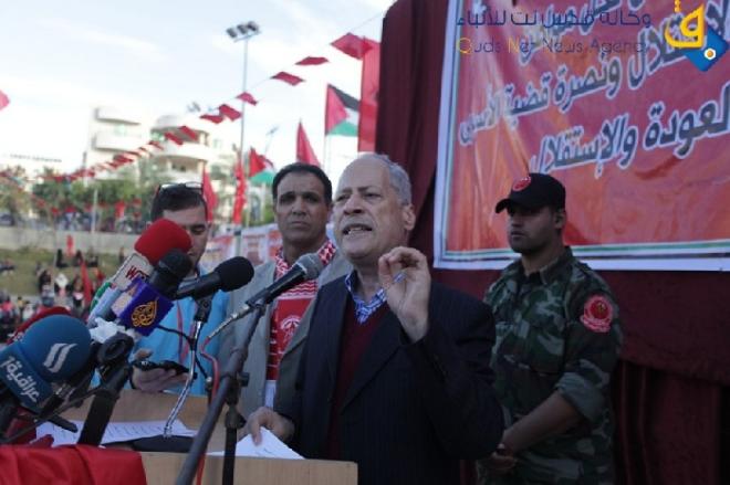 وجدد عضو المكتب السياسي دعوة الجبهة لحكومة حماس إلى الاستقالة، وبعدها حكومة السلطة في رام الله إلى الاستقالة وتشكيل حكومة التوافق الوطني، كما جدد دعوة الجبهة الديمقراطية إلى الموافقة الفورية على مبادرتها لإنهاء الانقسام واستعادة الوحدة الداخلية، لتنفيذ اتفاق القاهرة في 4 أيار/ مايو 2011 وتفاهمات شباط/ فبراير 2013 في القاهرة وبالارتكاز على وثيقة الوفاق الوطني.