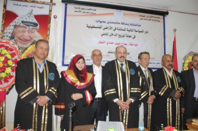 جاءت تلك الدراسة خلال مناقشة رسالة ماجستير في كلية الاقتصاد والعلوم الإدارية، للباحثة سماح نبيل النجار، اليوم، الموسومة بـ "دور السياسة المالية السائدة في المناطق الفلسطينية في إعادة توزيع الدخل المحلي", في برنامج الدراسات العليا لجامعة الأزهر بغزة، والتي بموجبها منحت لها درجة الماجستير من قبل لجنة المناقشة والحكم والتي تضم كل من الدكتور سمير أبو مدللة عميد كلية الاقتصاد والعلوم الإدارية بجامعة الأزهر مشرفاً ورئيساً، والدكتور فاروق دواس مشرفاً، والدكتور نسيم أبو جامع مناقشاً داخلياَ والدكتور خليل النمروطي مناقشا خارجياً.
