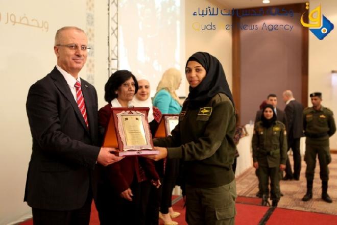 واعرب الحمد الله عن اعتزازه بجميع نساء فلسطين، وخاصة المبدعات والرائدات لوصولهن الى المواقع القيادية والريادية، في المؤسسة الامنية، والبلديات، وهيئات الحكم، والحكومة، والسلطة القضائية، والعديد من المجالات الحيوية، حيث يوجد 97 سيدة تعمل ضمن الفئة العليا برتبة وكيل ووكيل مساعد، وبلغ عدد العاملات في الفئة الوسطى من درجة C الى A 1431 موظفة بنسبة 22%، بينما بلغ عدد العاملات ضمن الخدمة المدنية 33096 موظفة بنسبة 41.5%.