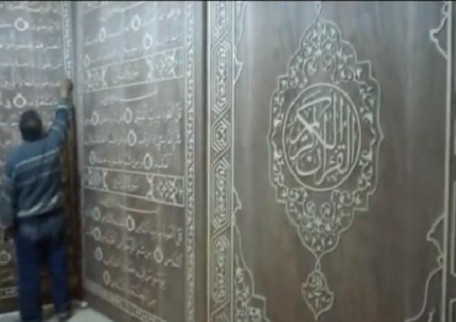عكف اللاجئ السوري في الأردن رياض نواف الراضي منذ أشهر بصناعة أكبر نسخة للقرآن الكريم في العالم مصنوعة من ألوح خشبية رقيقة ضخمة وليست ورقية.