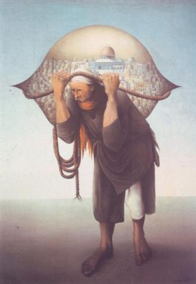 وفي لوحة "جمل المحامل" التي يعود تاريخها الى عام 1973 يقف حمال مسن وهو يكافح لوزن القدس على ظهره في تصوير للتطلعات الفلسطينية لإقامة دولة تتخذ من القدس الشرقية التي احتلتها اسرائيل عام 1967 عاصمة لها.
