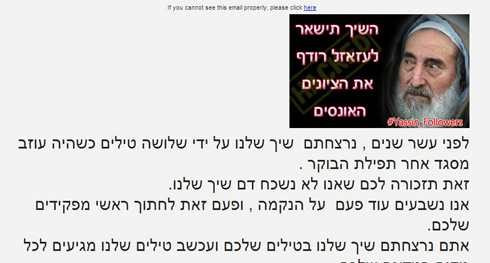 وجاء في الرسالة الالكترونية "لن ننسى دماء شيخنا، نعد مجددا بالانتقام له، وهذه المرة بقطع رؤوس زعمائكم"، مضيفة ان "الصهاينة قتلوا شيخنا بالصواريخ واليوم صواريخنا قادرة على ضرب اي مكان في الدولة الصهيونية"، وحملت الرسالة توقيع "تلامذة الشيخ ياسين".
