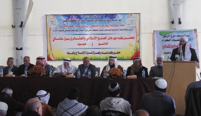نظمت لجنة إصلاح معسكر جباليا التابعة لرابطة علماء فلسطين مهرجان الصلح الإسلامي والعشائري بين عائلتي الدلو وعبيد وذلك على إثر حادث القتل المؤسف الذي أودى بحياة المرحوم بإذن الله: عمار وليد الدلو.