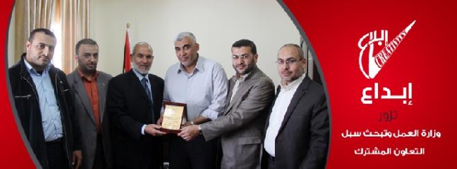 زار وفدٌ ممثلٌ عن مؤسسة إبداع للأبحاث والدراسات والتدريب وزير العمل والشؤون الاجتماعية محمد الرقب وذلك ضمن سلسلة زيارات تنفذها المؤسسة للتشبيك بين وتبادل المنفعة مع المؤسسات الحكومية والأهلية، وقد ضم الوفد صبحي اليازجي نائب رئيس مجلس الإدارة وأدهم البعلوجى عضو مجلس الإدارة ونبيل اسليم مدير المؤسسة.