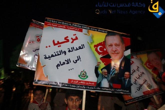وقال المتحدث في المسيرة وهو شاب ملتحي يضع وشاح لحماس" تركيا فلسطين، امة ما بتلين"، حسب مراسل وكالة قدس نت للأنباء في شمال غزة.